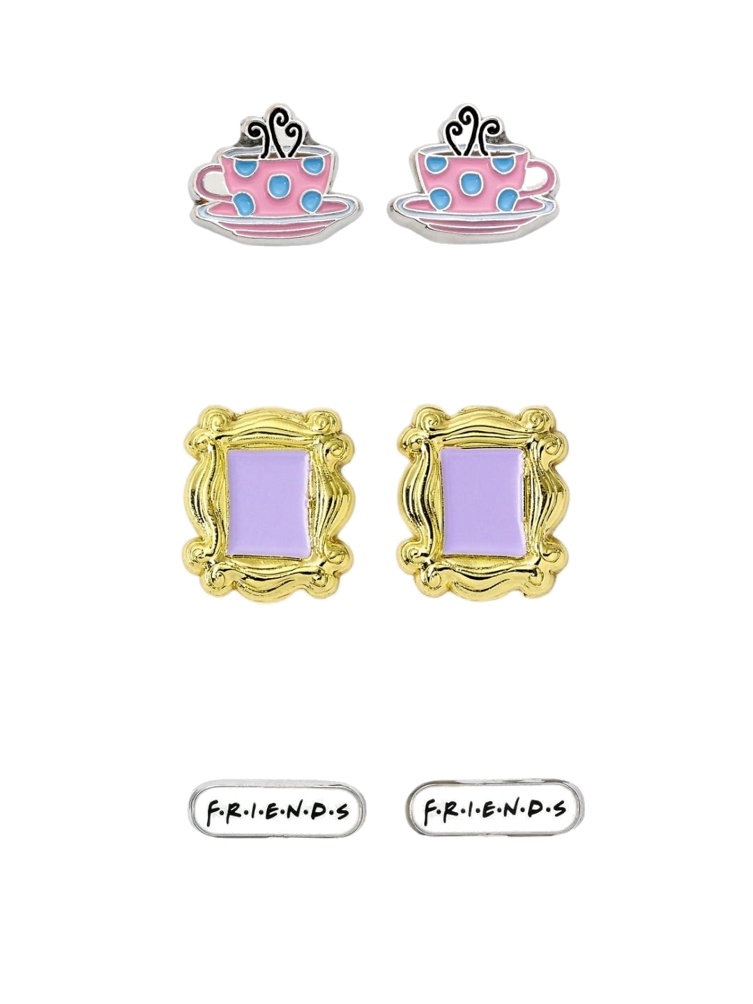 Αλλάξτε το στυλ σας με αυτό το σετ τριών σκουλαρικιών από τη σειρά Friends. Κάθε ένα από τα studs είναι εμπνευσμένο από τις πιο εμβληματικές στιγμές της σειράς, με σχέδια όπως το χαρακτηριστικό πλαίσιο στην πόρτα της Monica, ένα φλιτζάνι καφέ από το Central Perk, και το διάσημο λογότυπο της σειράς. Κατασκευασμένα από κράμα ψευδαργύρου και επαργυρωμένα, έρχονται στην επίσημη συσκευασία της σειράς, καθιστώντας τα το τέλειο δώρο για κάθε φαν.