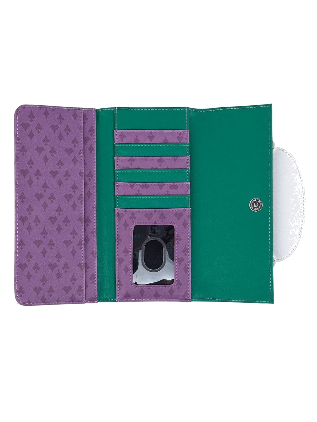 Αν είσαι φαν του Πρίγκιπα του εγκλήματος, The Joker, της DC Comics τότε αυτό το δερμάτινο πορτοφόλι της Loungefly που απεικονίζει τον Joker με τα μάτια του να στριφογυρίζουν, είναι το τέλειο δώρο για εσένα! - Επίσημο προϊόν - 20 x 9 cm - faux saffiano leather - Imported