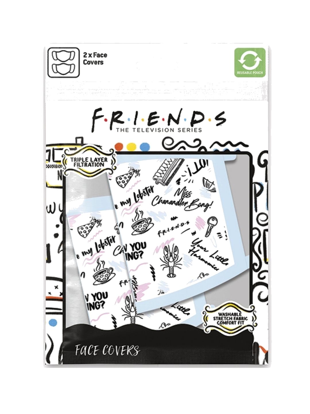 Δείξτε την αγάπη σας για τη διάσημη σειρά Friends ενώ προστατεύετε τον εαυτό σας και τους γύρω σας με αυτό το σετ από δύο μάσκες προσώπου. Κάθε μάσκα διαθέτει μοναδικά σχέδια με εμβληματικές φράσεις από τη σειρά, προσφέροντας στυλ και άνεση. Είναι πολλαπλών χρήσεων, καθώς μπορούν να πλυθούν και να επαναχρησιμοποιηθούν, διατηρώντας την προστασία και την ανθεκτικότητά τους.