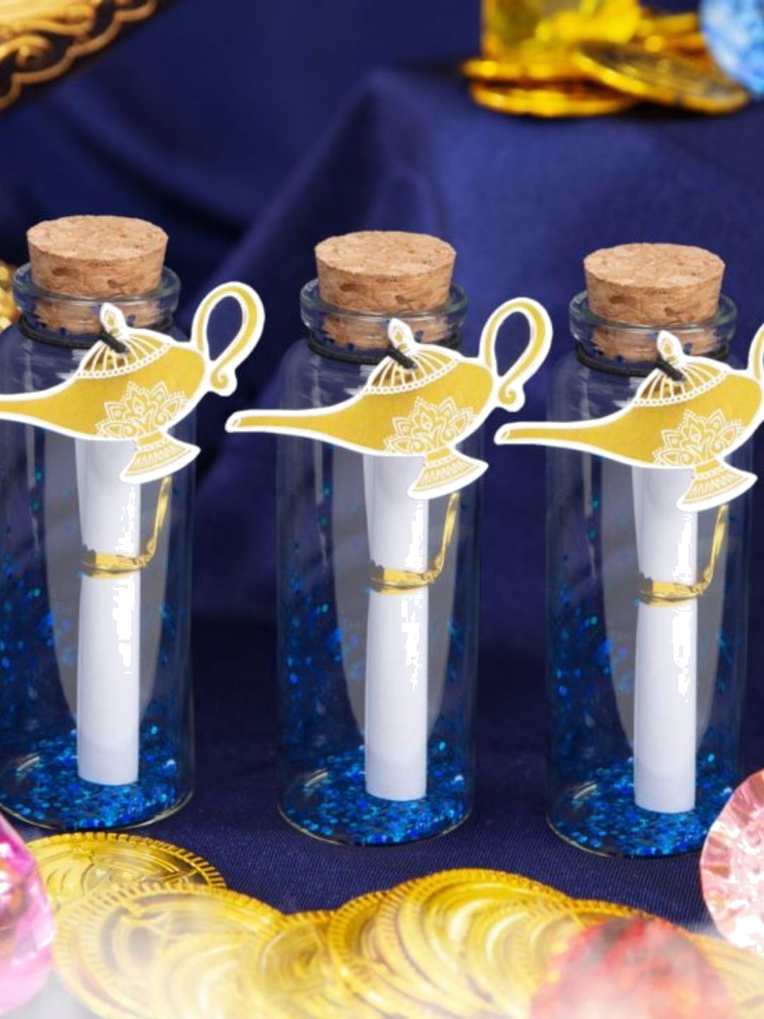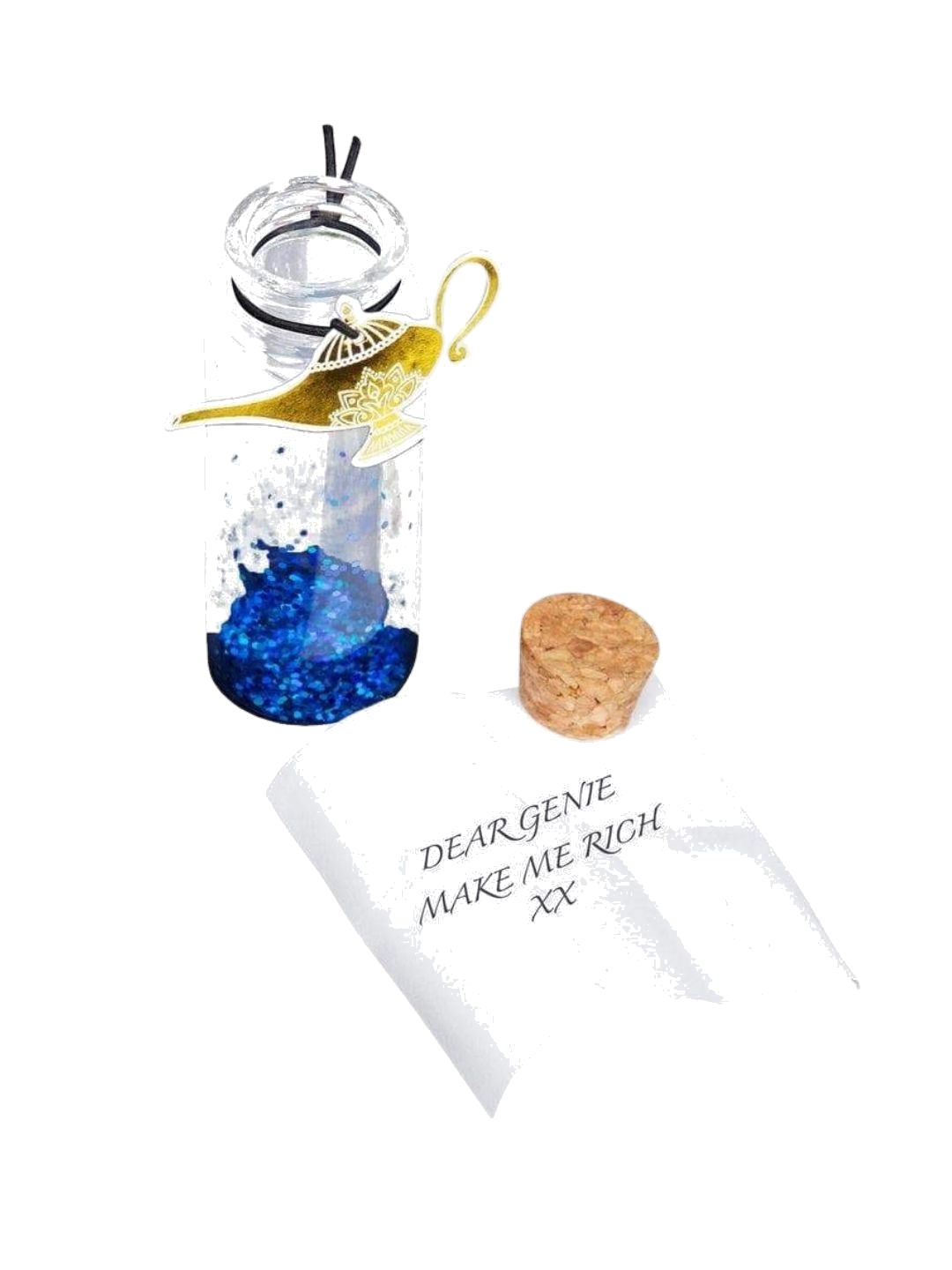 Ποιες τρεις ευχές θα ήθελες να πραγματοποιηθούν; Γράψε τες στο ρολό χαρτιού και ποιος ξέρει, ίσως γίνουν πραγματικότητα! Ένα μαγικό σετ με τρεις γυάλινες φιάλες με φελλό, που περιλαμβάνει ένα κενό ρολό χαρτιού, και είναι μερικώς γεμάτο με μπλε γκλίτερ και ένα χρυσό μενταγιόν σε σχήμα λάμπας λαδιού.
