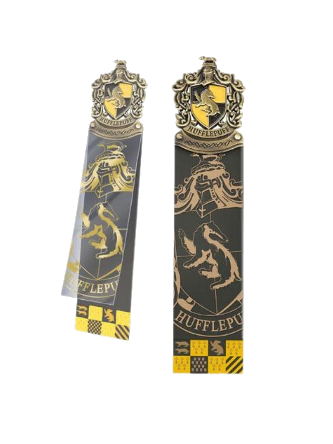Σχεδιασμένος στα χρώματα του κοιτώνα Hufflepuff, το κίτρινο και το μαύρο, ο σελιδοδείκτης διαθέτει ένα πλαστικό πτερύγιο για να τοποθετείται πάνω από τις σελίδες σας και στην κορυφή του φέρει το έμβλημα του Hufflepuff από χυτό μέταλλο με σμάλτο.