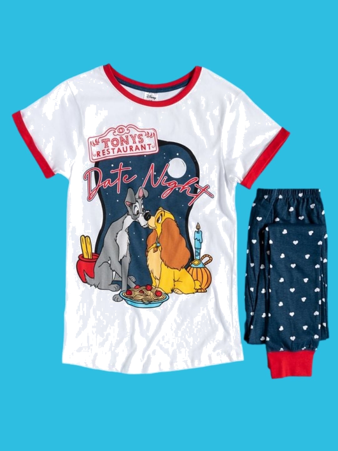 Ζήσε ξανά την μαγική ιστορία αγάπης από την ταινία της Disney, Lady and Tramp και ταξίδεψε στην χαρακτηριστική σκηνή του δείπνου, με αυτό το υπέροχο σετ πιτζάμες! - Επίσημο προϊόν - 100% Cotton - Imported