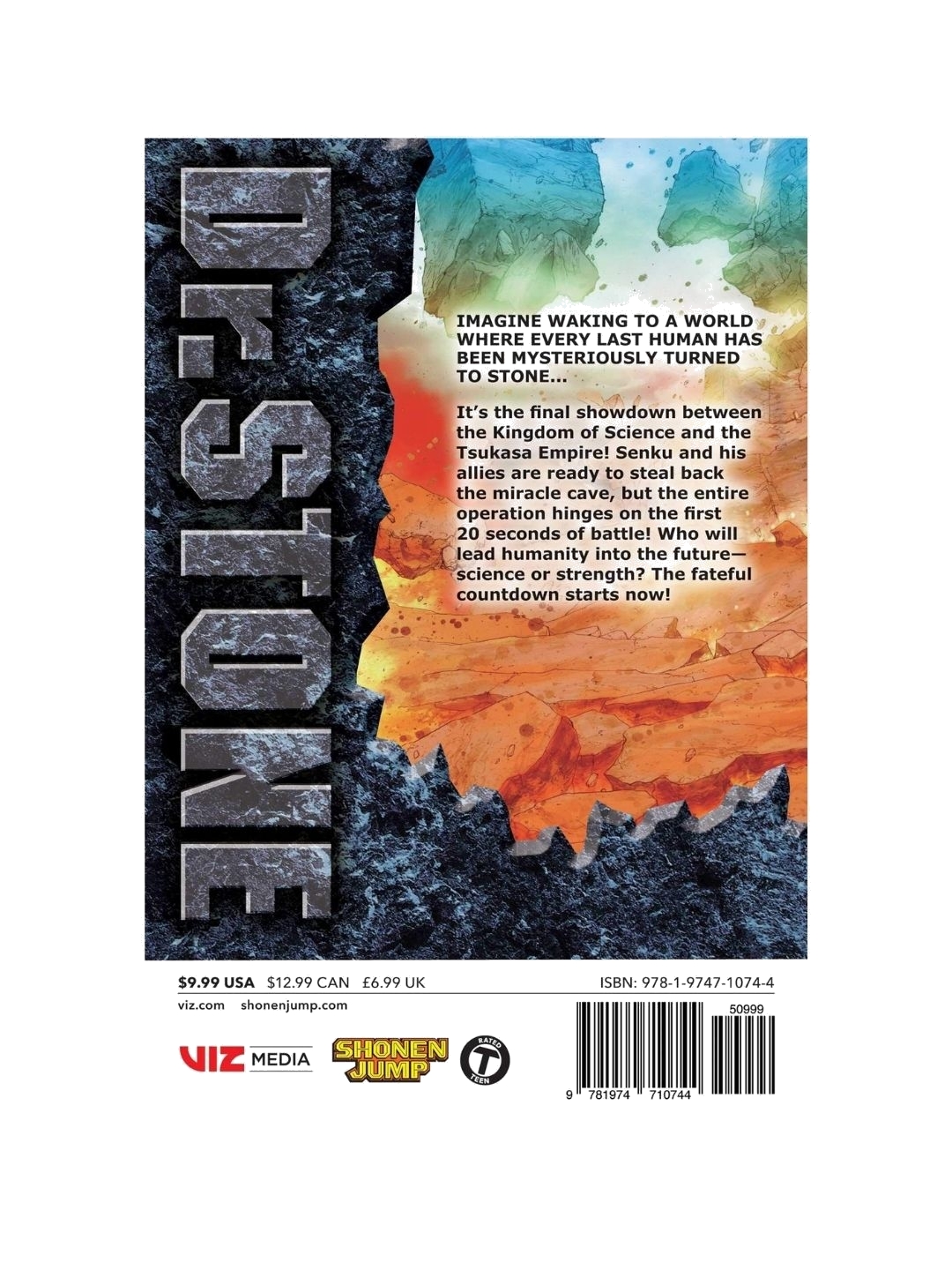 To Volume 9 της μοναδικής σειράς manga Dr. Stone! Φαντάσου να ξυπνούσες μια μέρα και όλοι οι άθρωποι του πλανήτη να είχαν πετρώσει! Στο Manga Dr. Stone, μια μέρα όλοι οι άνθρωποι καλύφθηκαν με πέτρα! Πολλές χιλιάδες χρόνια αργότερα, ο Taiju ελευθερώθηκε και κατάλαβε πως ζούσε ανάμεσα σε αγάλματα. Η κατάσταση φαινόταν πολύ δύσκολη μέχρι που βρέθηκε με τον φίλο του και λάτρη της επιστήμης Senku! Μαζί θα προσπαθήσουν να σώσουν τον κόσμο με την δύναμη της επιστήμης! "It's the final showdown between the Kingdom of Science and the Tsukasa Empire! Senku and his allies are ready to steal back the miracle cave, but the entire operation hinges on the first 20 seconds of battle! Which will lead humanity into the future-science or strength? The fateful countdown starts now! " - Paperback - Publisher Viz Media, Subs. of Shogakukan Inc - Author Riichiro Inagaki , Illustrated by Boichi