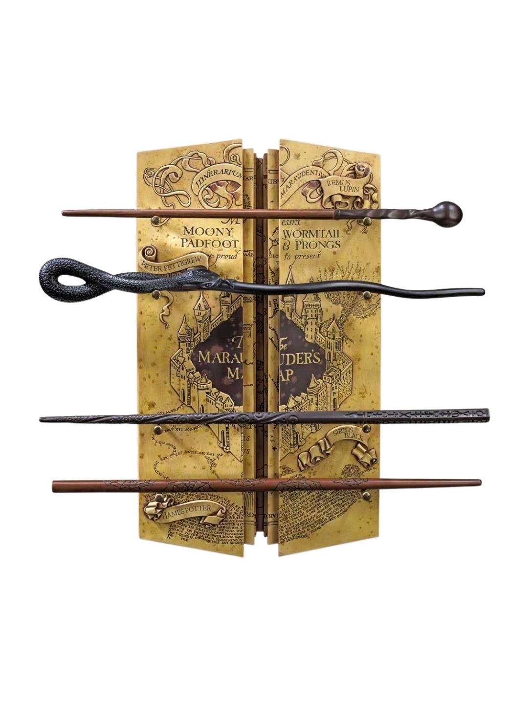 Ανακαλύψτε τη μαγεία των Marauders με το εντυπωσιακό Harry Potter The Marauder's Wand Collection. Η συλλογή περιλαμβάνει τα ραβδιά των Remus Lupin, Peter Pettigrew, Sirius Black και James Potter, τοποθετημένα σε μια μοναδική βάση που αναπαριστά τον χάρτη των Marauders, κατασκευασμένη από ρητίνη και χειροποίητα ζωγραφισμένη. Η βάση διαθέτει δύο γάντζους για ανάρτηση στον τοίχο και έχει διαστάσεις περίπου 36 x 21 εκ.