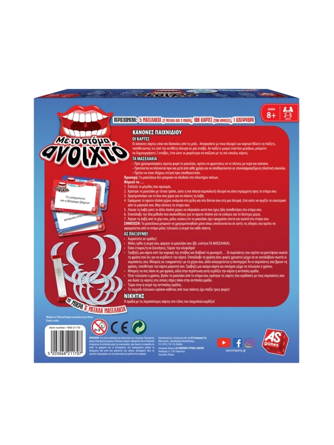 Το παιχνίδι που ενώνει τις οικογένειες, κάνοντας μικρούς και μεγάλους να κλαίνε από τα γέλια! Φόρεσε το ειδικό μασελάκι, τράβηξε μια κάρτα και προσπάθησε να μιλήσεις... Θα καταλάβει η ομάδα σου τη φράση που θέλεις να περιγράψεις; Ο χρόνος μετρά αντίστροφα και όλοι αναρωτιούνται τι λες... Η ομάδα με τις περισσότερες κάρτες κερδίζει! Περιλαμβάνονται μικρά και μεγάλα μασελάκια για μικρούς και μεγάλους. - Ηλικία 8+ - Παίκτες: 2-5 - Τύπος Παιχνιδιού Standalone - Εκδότης AS Company - Ελληνικά - Imported