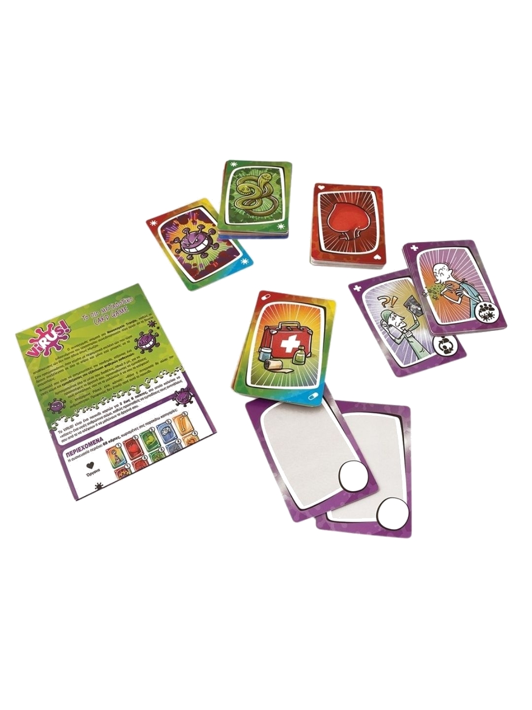 Το Virus! είναι το πιο μεταδοτικό και διασκεδαστικό card game που θα σε βάλει στο ρόλο ενός γιατρού σε αποστολή! Ένας συναγερμός έχει ξεσπάσει στο Νοσοκομείο Tranjis, καθώς πειραματικά στελέχη ιών έχουν ξεφύγει από τα δοχεία αποθήκευσής τους και απειλούν να μολύνουν τα πάντα. Μόνο εσύ μπορείς να τα σταματήσεις! Δημιούργησε ανοσία στο σώμα σου, προστάτευσε τα όργανά σου και χρησιμοποίησε κάθε διαθέσιμο μέσο – ηθικό ή όχι – για να εμποδίσεις τους αντιπάλους να τα μολύνουν ή να τα κλέψουν. Ο πρώτος παίκτης που θα καταφέρει να τοποθετήσει 4 διαφορετικά υγιή όργανα μπροστά του, κερδίζει το παιχνίδι!