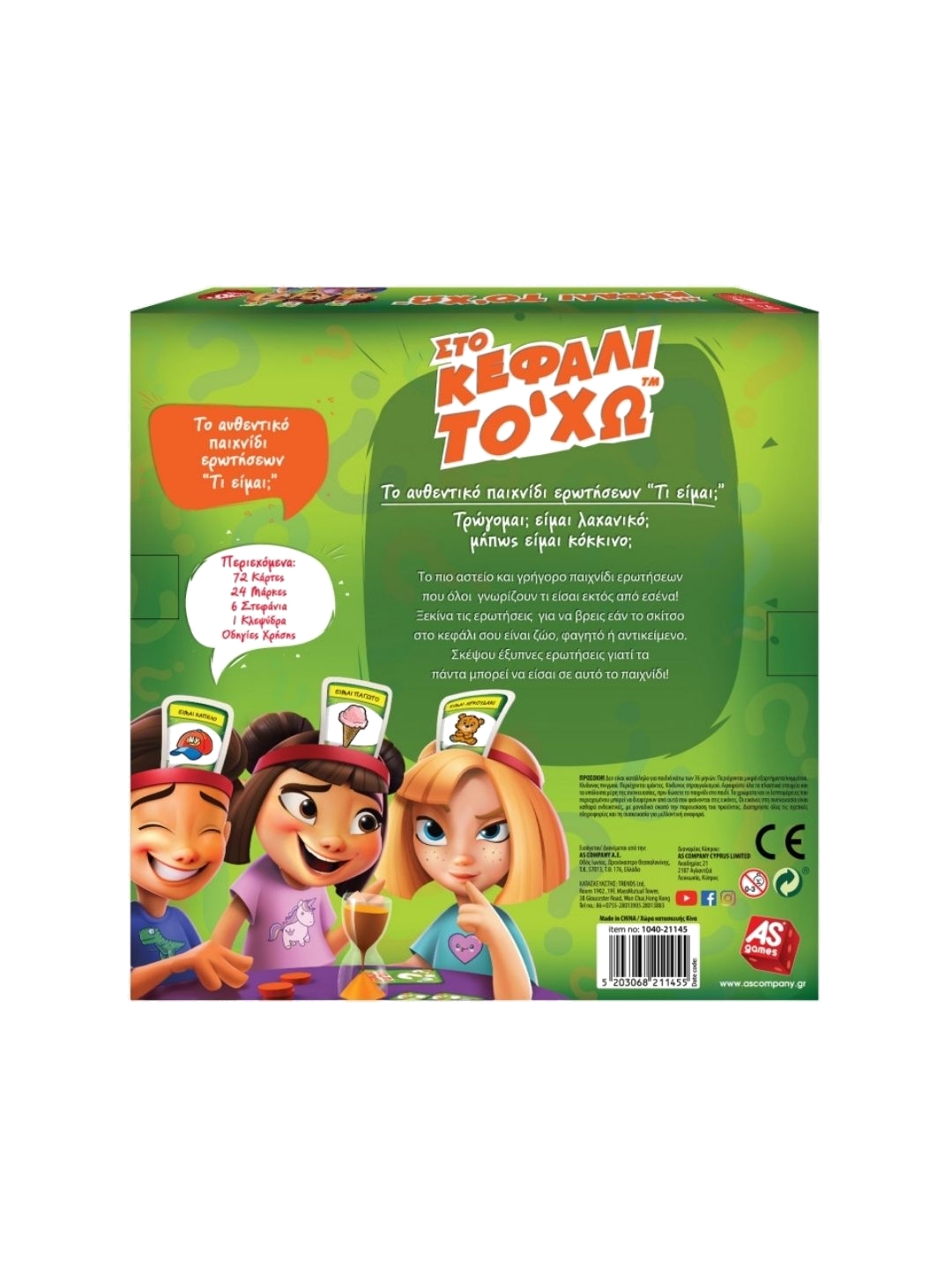 Τρώγομαι; Είμαι λαχανικό; Μήπως είμαι κόκκινο; Μπορεί να είσαι τα πάντα… ζώο, φαγητό ή αντικείμενο! Κάνε έξυπνες ερωτήσεις και βρες τι κρύβεται στο σκίτσο στο κεφάλι σου, πριν ο χρόνος τελειώσει! Ένα απλό, γρήγορο και διασκεδαστικό παιχνίδι για όλη την οικογένεια!