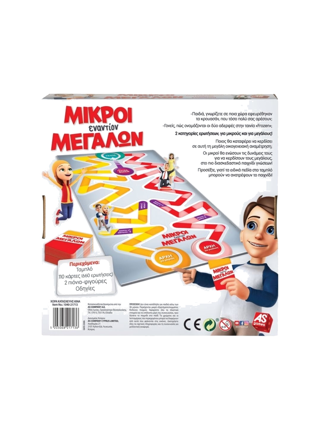 Παιδιά, σε ποια χώρα εφευρέθηκαν τα κρουασάν, που τόσο πολύ σας αρέσουν; Γονείς, πώς ονομάζονται οι 2 αδερφές στην ταινία Frozen; 660 ερωτήσεις, για μικρούς και για μεγάλους! Ποιος θα τα καταφέρει σε αυτή τη μεγάλη οικογενειακή αναμέτρηση; Οι μικροί θα ενώσουν τις δυνάμεις τους για να κερδίσουν τους μεγάλους, στο πιο διασκεδαστικό παιχνίδι γνώσεων! Προσέξτε γιατί τα ειδικά πεδία στο ταμπλό μπορεί να ανατρέψουν το παιχνίδι! - Ηλικία 7+ - Παίκτες: 2+ - Τύπος Παιχνιδιού Standalone - Εκδότης AS Company - Ελληνικά - Imported