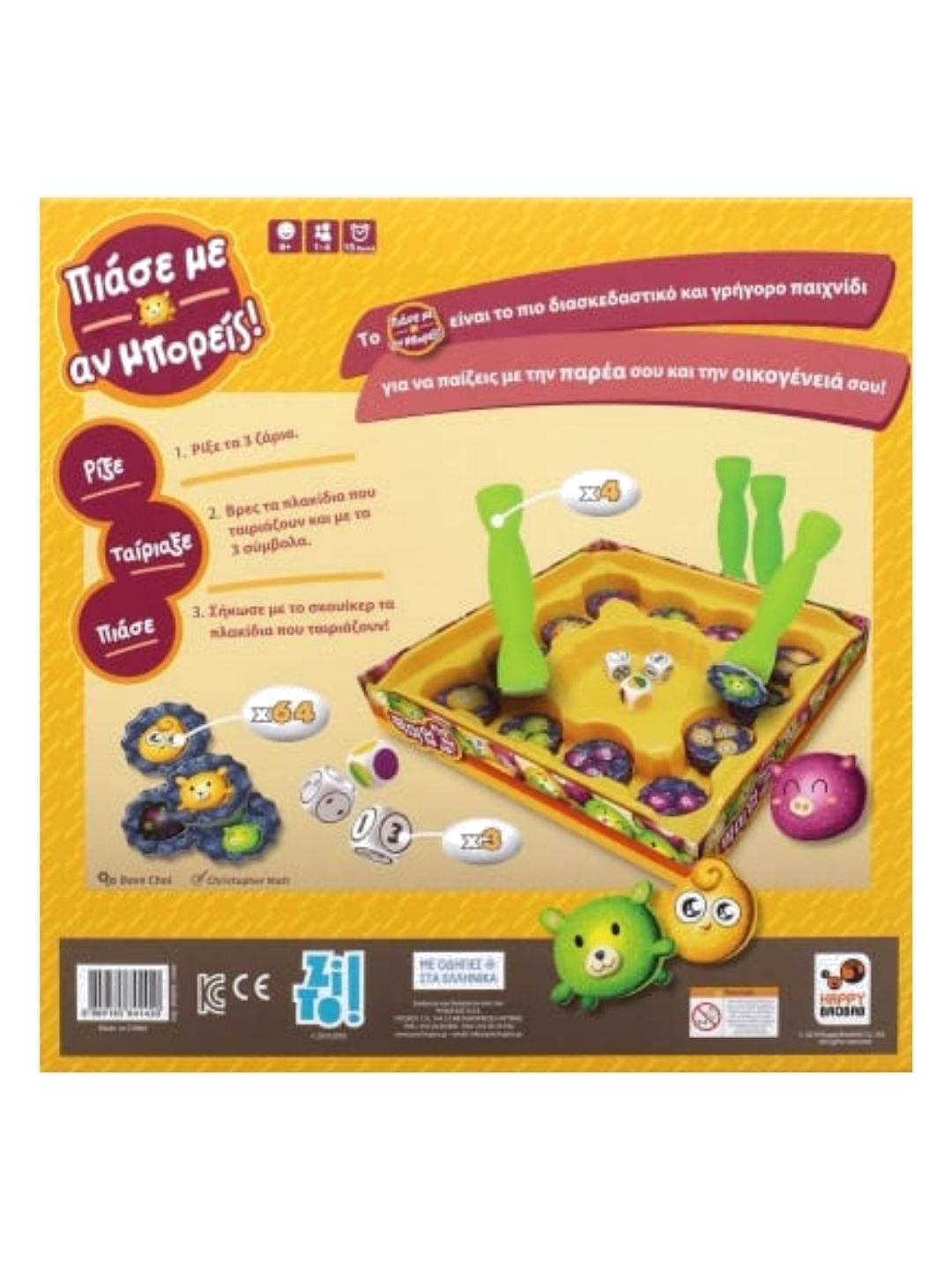 Το ZITO! Πιάσε Με Αν Μπορείς είναι ένα γρήγορο, διασκεδαστικό και διαδραστικό παιχνίδι για όλη την οικογένεια και την παρέα. Οι παίκτες ρίχνουν τα ζάρια, εντοπίζουν τα πλακίδια που ταιριάζουν με τρία σύμβολα ταυτόχρονα και τα σηκώνουν χρησιμοποιώντας το σκουίκερ, σε ένα παιχνίδι που συνδυάζει ταχύτητα, παρατηρητικότητα και γρήγορες αντιδράσεις. Το παιχνίδι περιλαμβάνει 54 πλακίδια χαρακτήρων, 10 πλακίδια μπαλαντέρ, 4 σκουίκερ, 3 ζάρια και βιβλίο κανόνων, προσφέροντας μοναδική εμπειρία για μικρούς και μεγάλους. Κάθε γύρος είναι γρήγορος και γεμάτος ένταση, καθιστώντας το ιδανικό για 15λεπτες διασκεδαστικές παρτίδες.