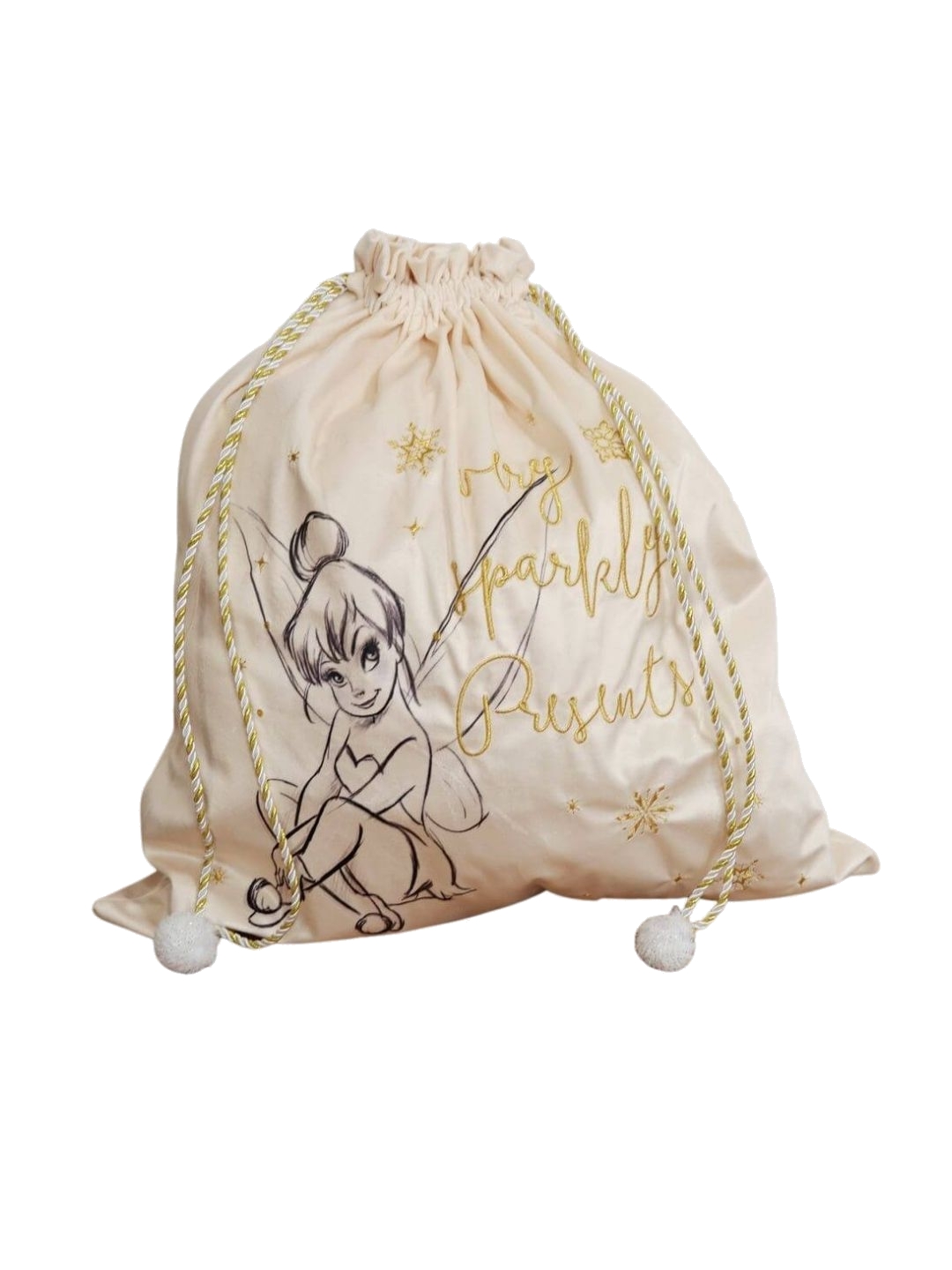 Δώστε στον Άγιο Βασίλη το ιδανικό μέρος για να αφήσει τα δώρα με αυτόν τον υπέροχο βελούδινο χριστουγεννιάτικο σάκο εμπνευσμένο από τον κόσμο του Peter Pan. Κατασκευασμένος από κρεμ βελουτέ ύφασμα, διαθέτει μια κομψή μαύρη εικονογράφηση της Tinkerbell, χρυσό κέντημα με την επιγραφή "VERY SPARKLY PRESENTS", καθώς και ένα διακριτικό σχέδιο με χρυσές νιφάδες χιονιού. Ο σάκος κλείνει με χρυσά και ασημένια κορδόνια περίσφιξης που διαθέτουν λευκές φουντίτσες, προσθέτοντας μια ακόμα πινελιά πολυτέλειας.