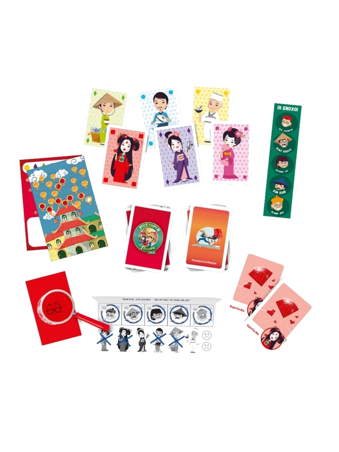 - Περιέχει: 24 κάρτες μυστηρίων, 42 κάρτες μαρτύρων, 18 κάρτες αντικειμένων, 12 κάρτες τυχερά μπισκότα, 1 κάρτα-μάσκα, 1 λίστα ενόχων, 1 κινέζικο δράκο, 1 κόκκινο αποκωδικοποιητή, 1 μεγεθυντικό φακό, 1 μπλοκ έρευνας, οδηγίες