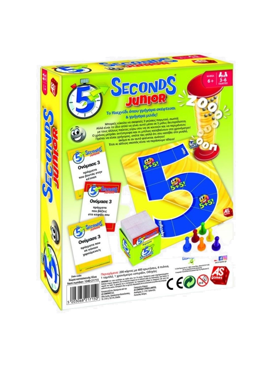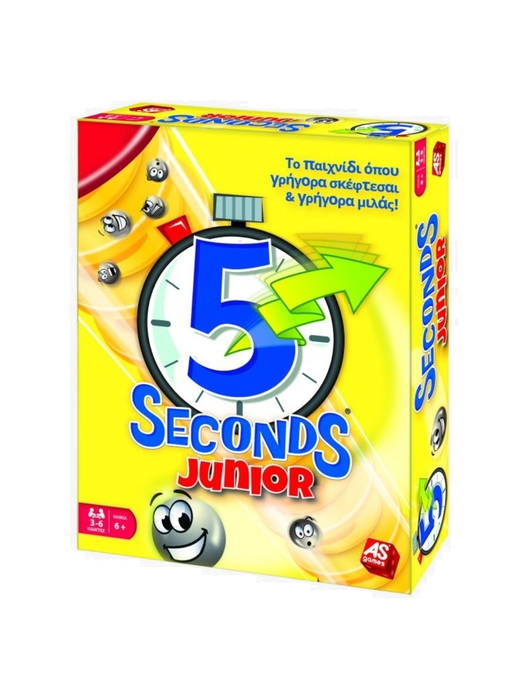 Επιτραπέζιο 5 Seconds Junior. Το συναρπαστικό παιχνίδι ταχύτητας και ετοιμότητας για ατελείωτες στιγμές γέλιου, στην πιο απλή του έκδοση! Σκέψου προσεκτικά και δώσε 3 απαντήσεις για μια συγκεκριμένη ερώτηση σε μόλις 5 δευτερόλεπτα! Είσαι αρκετά γρήγορος και ετοιμόλογος; Ο χρόνος σίγουρα δεν είναι με το μέρος σου, απλά πες ότι σου έρχεται στο μυαλό και γίνε ο νικητής φτάνοντας πρώτος στο τέρμα! Κατάλληλο για μικρά παιδιά!