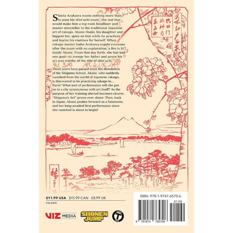 Στο Akane-banashi, Vol. 17, η Akane Osaki συνεχίζει το ταξίδι της στον κόσμο του rakugo για να τιμήσει και να εκδικηθεί τον πατέρα της. Τρία χρόνια έχουν περάσει από τη διάλυση της Shiguma School και η Akane, που εξαφανίστηκε μυστηριωδώς από τη σκηνή του ιαπωνικού rakugo, εντοπίζεται να εξασκείται στη Παρίσι—την πόλη της τέχνης. Τι είδους παράσταση θα παρουσιάσει σε μια πόλη τόσο εμβληματική για τις τέχνες; Καθώς αποκαλύπτεται ο σκοπός της εκπαίδευσής της στο εξωτερικό, η «τέχνη του Shiguma» πλησιάζει όλο και περισσότερο.