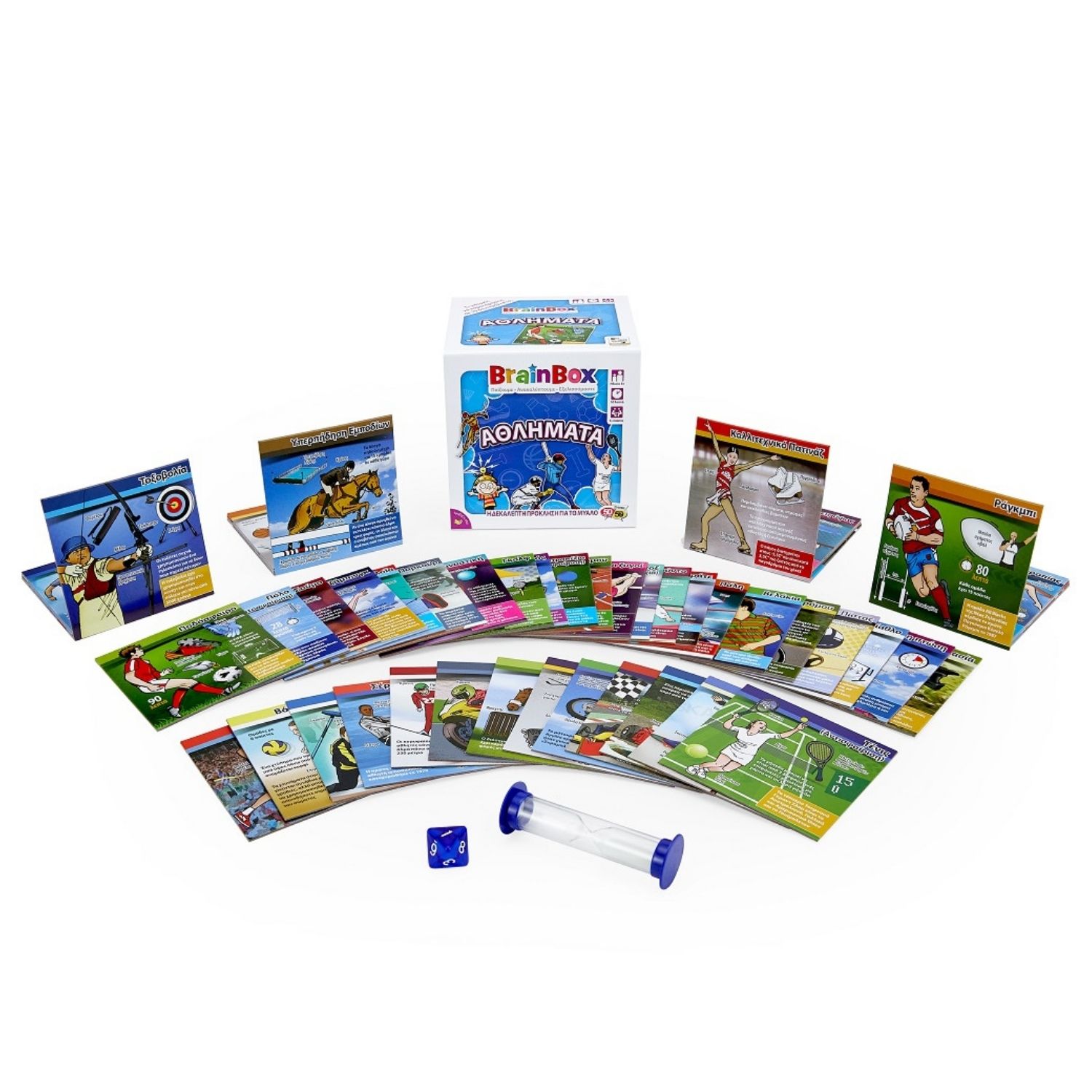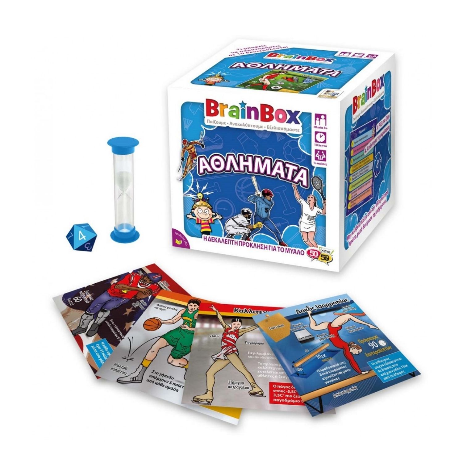Σήκω απ'τη θέση σου, κάνε ζέσταμα...ώρα για παιχνίδι! Γνώρισε τα πιο δημοφιλή αθλήματα στον κόσμο. Διάλεξε μια κάρτα μέσα από το BrainBox. Αναποδογύρισε την κλεψύδρα και προσπάθησε να μάθεις απ'έξω την κάρτα σε 10 δευτερόλεπτα! Τώρα ρίξε το ζάρι και απάντησε στην αντίστοιχη ερώτηση. Αν απαντήσεις σωστά κρατάς την κάρτα, αν απαντήσεις λάθος βάζεις την κάρτα πάλι μέσα στο BrainBox.