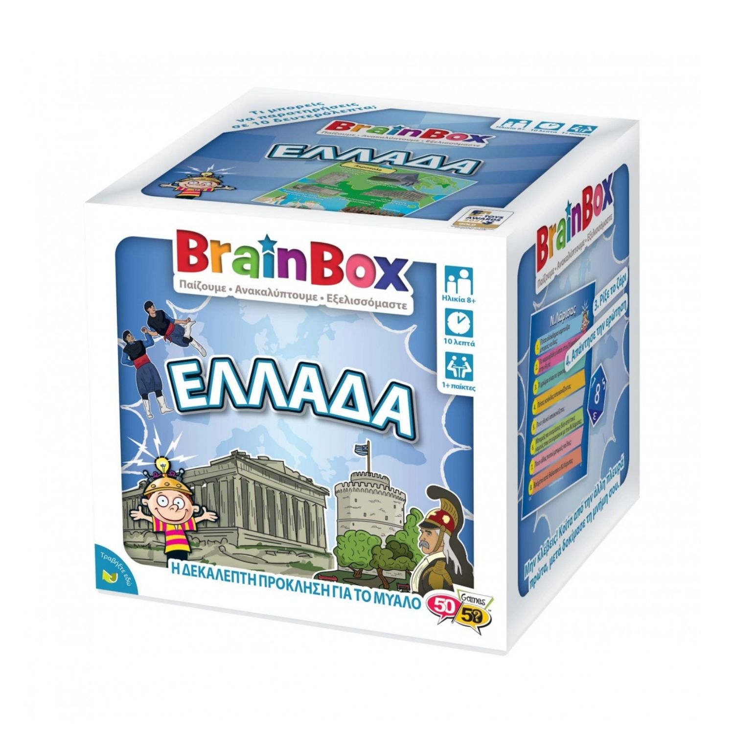 Το BrainBox Ελλάδα έχει σχεδιαστεί για να προσφέρει απίστευτες στιγμές διασκέδασης σε όλη την οικογένεια και την παρέα. Το παιχνίδι βοηθάει στη βελτίωση της παρατηρητικότητας και των μνημονικών ικανοτήτων, ενώ ταυτόχρονα εμπλουτίζει τις γνώσεις σου για τους νομούς, τις μεγαλύτερες πόλεις και τα νησιά της Ελλάδας. Κάθε κάρτα περιέχει εικόνες με μνημεία, ανθρώπους, φαγητά, ζώα και πολλές ακόμη ενδιαφέρουσες και διασκεδαστικές πληροφορίες! Από τη Θεσσαλονίκη ως την Κρήτη, από την Κέρκυρα ως τη Ρόδο και την Κύπρο, αυτό το BrainBox σε ταξιδεύει σε όλη την Ελλάδα. Αναποδογύρισε την κλεψύδρα και προσπάθησε να μάθεις την κάρτα απ’ έξω σε 10 δευτερόλεπτα. Στη συνέχεια, ρίξε το ζάρι και απάντησε στην αντίστοιχη ερώτηση. Αν απαντήσεις σωστά, κρατάς την κάρτα, ενώ αν απαντήσεις λάθος, η κάρτα επιστρέφει στο BrainBox. Ο σκοπός του παιχνιδιού είναι να μαζέψεις τις περισσότερες κάρτες μέσα σε 10 λεπτά.