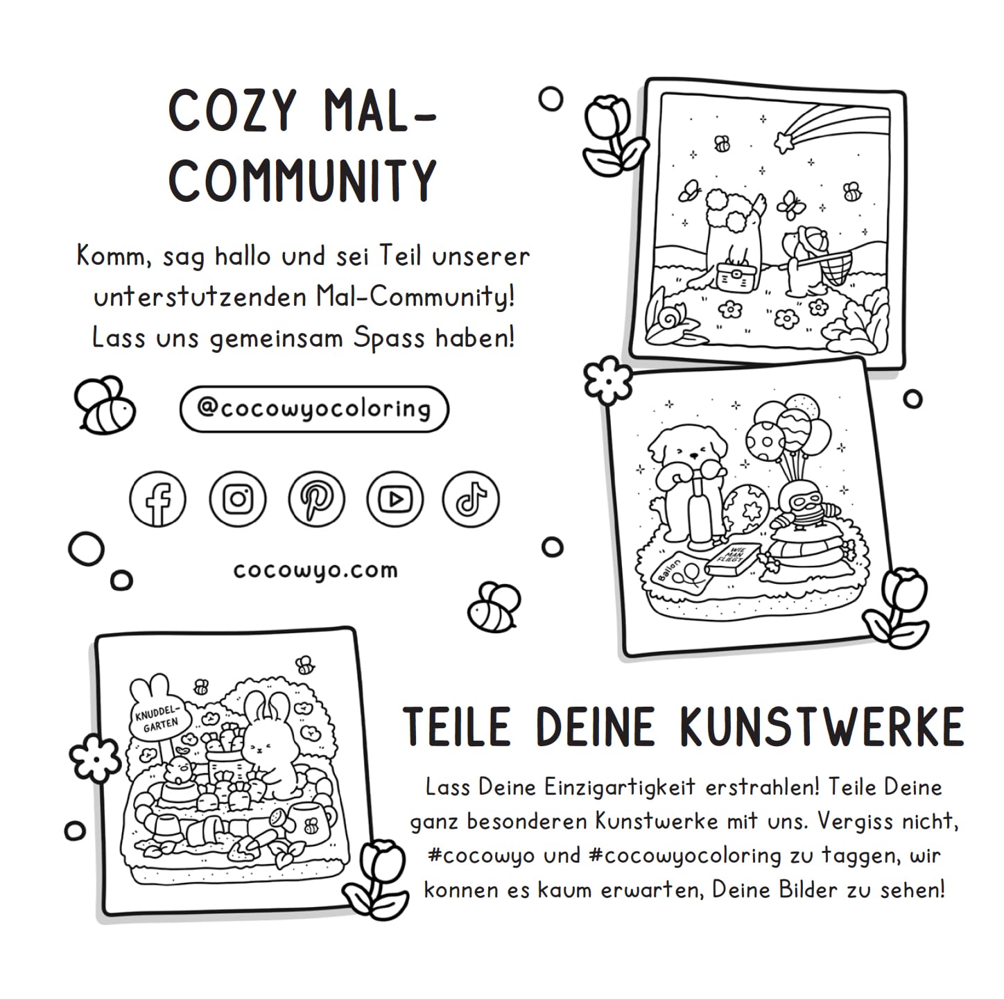 Το αγαπημένο σας Coloring Book τώρα και στα Γερμανικά! Οι παγκοσμίου φήμης καλλιτέχνες βιβλίων ζωγραφικής Coco Wyo λανσάρουν την επόμενη προσθήκη στον εκδοτικό τους κολοσσό – το COZY CUTIES είναι ο τέλειος τρόπος για να χαλαρώσετε και να ξεκουραστείτε αυτή την Άνοιξη! Μια ανάσα φρέσκου αέρα! Χαλαρώστε και ξεκουραστείτε με αυτό το αξιολάτρευτο βιβλίο ζωγραφικής. Αγκαλιάστε έναν κόσμο από cozy cuties σε αυτές τις χαλαρωτικές σελίδες ζωγραφικής! Ο ήλιος λάμπει και τα λουλούδια έχουν αρχίσει να ανθίζουν, οπότε πάρτε τους μαρκαδόρους σας και νιώστε άνετα με την Coco Wyo! Αυτό το όμορφο βιβλίο είναι γεμάτο με γοητευτικά σχέδια για να τα χρωματίσετε – κήπους που ανθίζουν, μωρά ζώα και ηλιόλουστους ουρανούς! Αυτά τα cozy cuties είναι ο τέλειος σύντροφος για μια χαλαρωτική μέρα ζωγραφικής με απλές, χαριτωμένες σελίδες που μπορείτε να ολοκληρώσετε σε μία συνεδρίαση! Το Cozy Cuties διαθέτει γλυκές και ακαταμάχητες εικόνες για τους λάτρεις της ζωγραφικής όλων των ηλικιών!