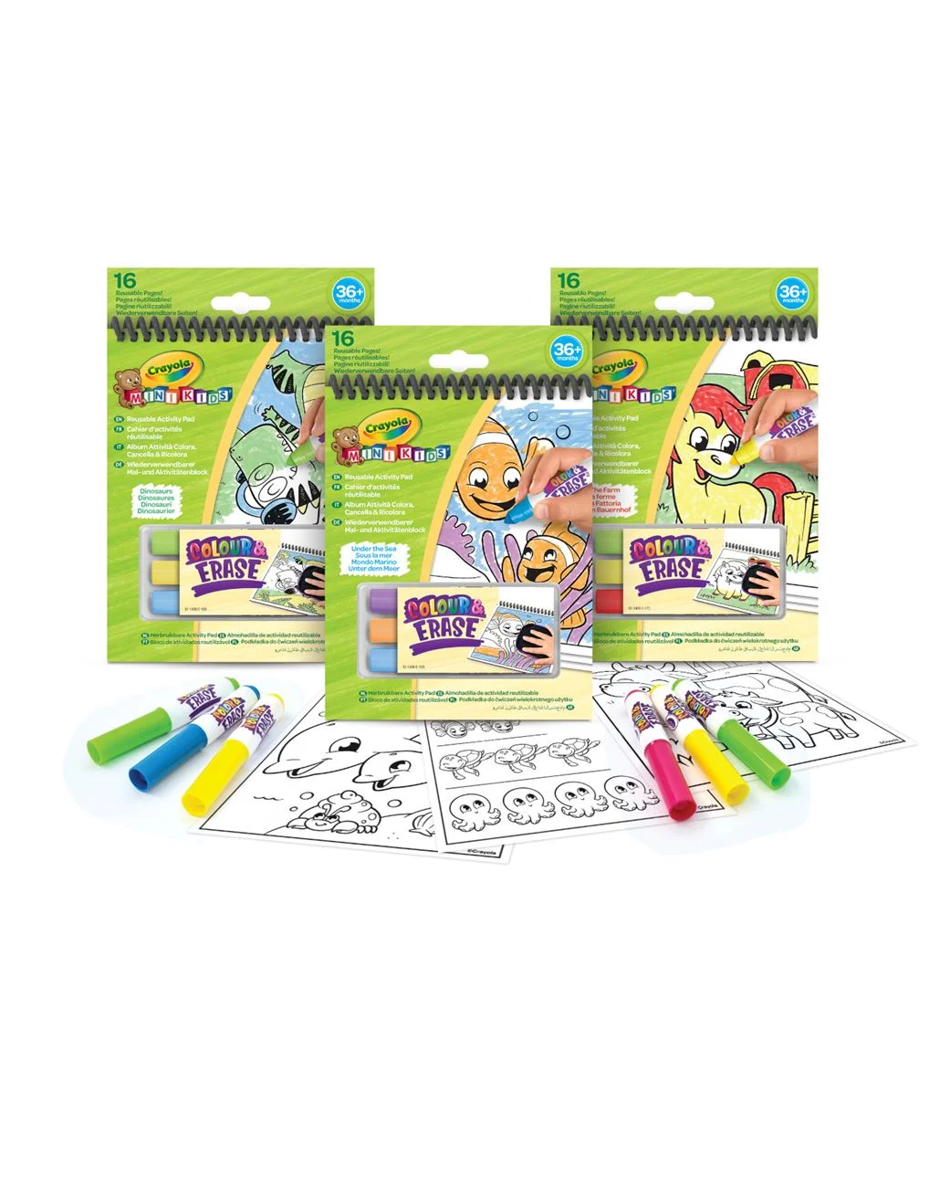 Διατίθεται σε 3 διαφορετικά σχέδια: Δεινόσαυροι, Ζώα της Φάρμας, Ζώα της Θάλασσας (καθένα πωλείται ξεχωριστά). Το σετ διατίθεται 1 τεμάχιο με τυχαία επιλογή. Κάθε σετ περιλαμβάνει 8 επαναχρησιμοποιήσιμες σελίδες δραστηριοτήτων διπλής όψης (13 x 18 εκ) και 3 πλενόμενους μαρκαδόρους, οι οποίοι μπορούν να αντικατασταθούν με οποιουσδήποτε άλλους πλενόμενους μαρκαδόρους της Crayola (πωλούνται ξεχωριστά).