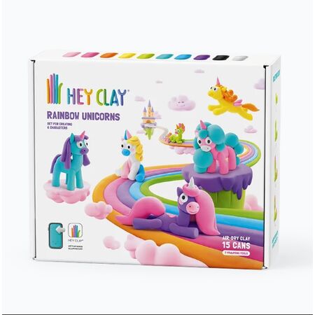 Δημιούργησε τους πιο μαγικούς και πολύχρωμους μονόκερους με πηλό που στεγνώνει φυσικά στον αέρα χωρίς ψήσιμο. Το σετ Rainbow Unicorns περιλαμβάνει 15 δοχεία πολύχρωμου, μαλακού πηλού και προσφέρει ατελείωτη δημιουργική διασκέδαση για παιδιά από 3 ετών και άνω. Μέσα από τη διαδραστική εφαρμογή Hey Clay app, τα παιδιά ακολουθούν εύκολα βήματα για να φτιάξουν χαριτωμένους και πολύχρωμους μονόκερους, ενισχύοντας τη λεπτή κινητικότητα, τη δημιουργικότητα, τη φαντασία και τη συγκέντρωσή τους με απόλυτη ασφάλεια, ενώ οι φιγούρες μπορούν να χρησιμοποιηθούν για παιχνίδι ή διακόσμηση.