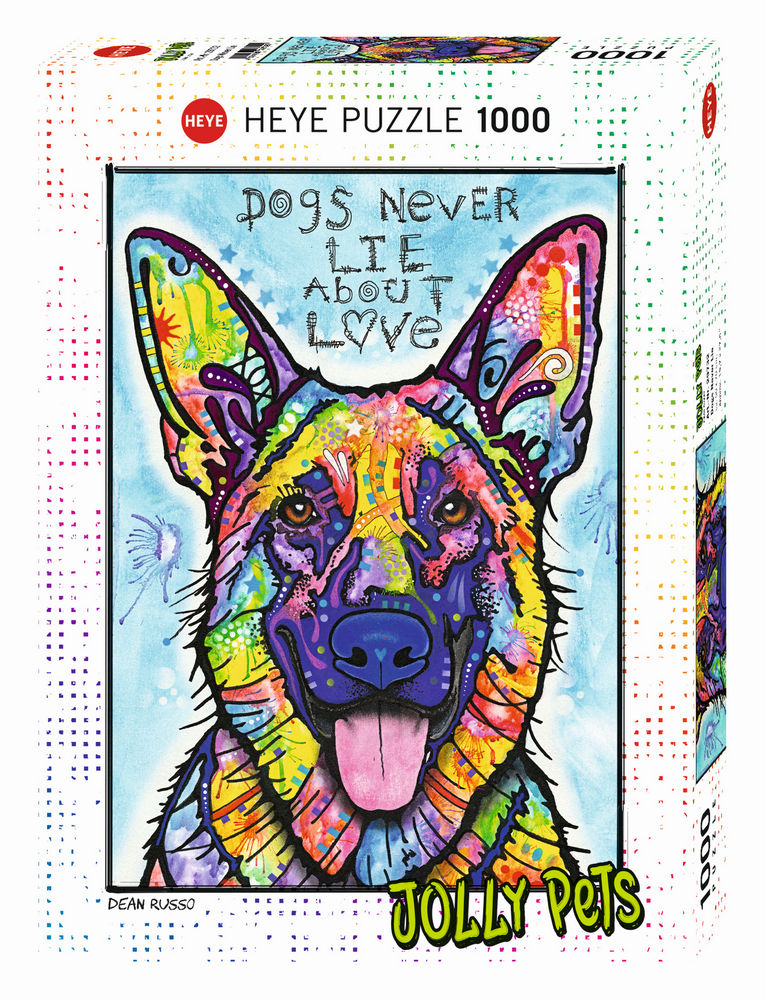 Το Παζλ 29732 St Jolly Pets Dogs Never Lie 1000 Κομμάτια παρουσιάζει τα αγαπημένα σκυλιά του Dean Russo μέσα από μια ζωντανή και πολύχρωμη σύνθεση. Ο καλλιτέχνης χρησιμοποιεί παστέλ, μελάνι, χρωματιστά μολύβια, ακρυλικά και σπρέι, δημιουργώντας λεπτομερή και εντυπωσιακά σχέδια που κάνουν το παζλ διασκεδαστικό και καθηλωτικό. Ιδανικό για όσους αγαπούν ζώα, μοντέρνα τέχνη και πολύχρωμα παζλ.
