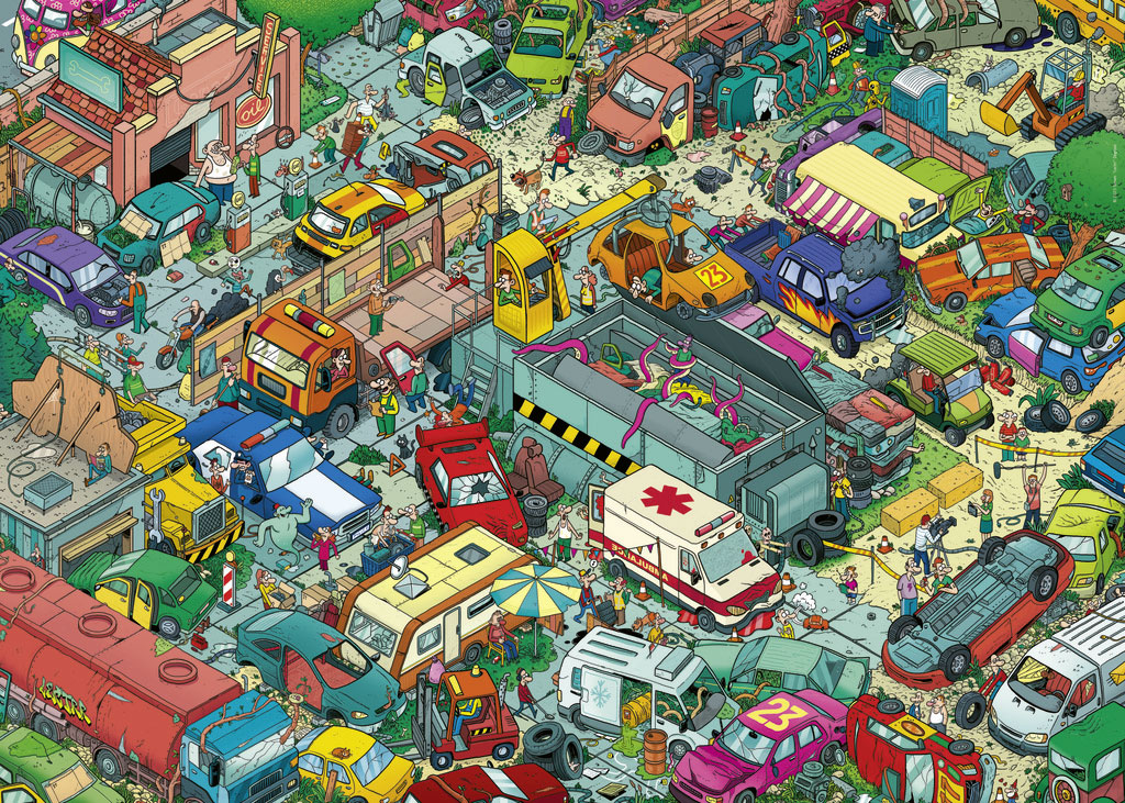 Αυτό το αυτοκινητικό νεκροταφείο δεν είναι τελικός σταθμός! Εδώ συνεχίζεται η δραστηριότητα, η δημιουργία και η ζωή – με ανθρώπους που ζουν, εργάζονται και ακόμα και βιντεοσκοπούν μέσα σε αυτό το περιβάλλον. Το παζλ αποτυπώνει με ζωντάνια και χιούμορ την έντονη καθημερινότητα του χώρου και τονίζει τη σημασία του ανακυκλωμένου και δημιουργικού τρόπου ζωής.