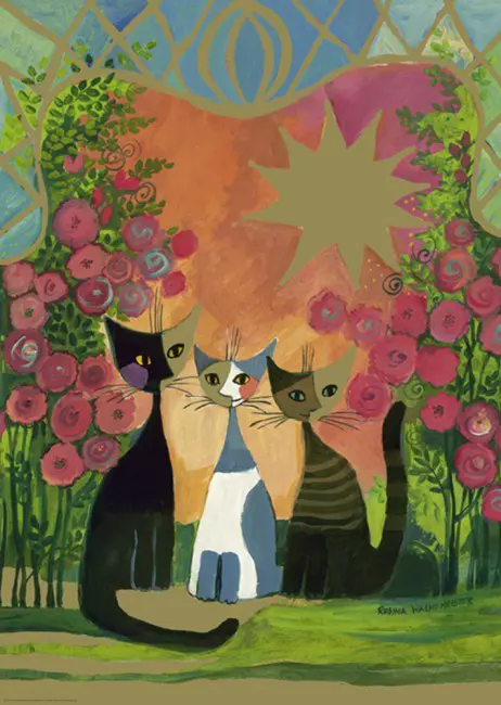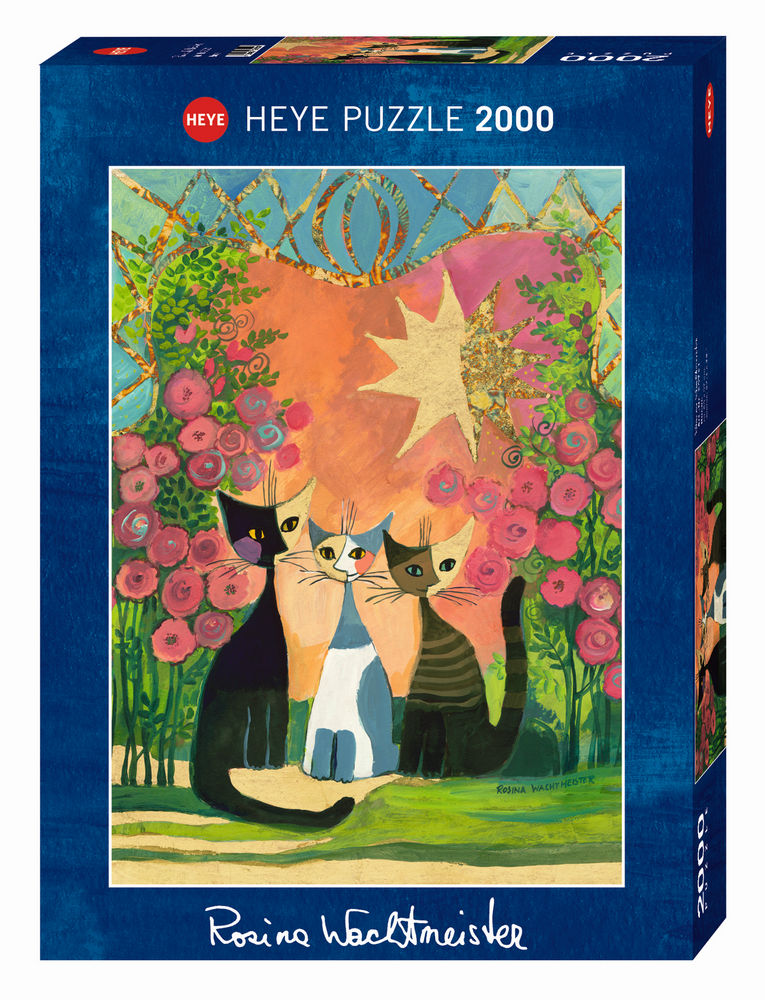 Σε ιδανικό καιρό, πλαισιωμένοι από υπέροχα λουλούδια και καταπράσινα φυτά, οι τρεις αναγνωρίσιμοι γάτοι της Rosina Wachtmeister ξεχωρίζουν ιδιαίτερα. Το παζλ αποτελείται από 2000 κομμάτια. Η Heye προσφέρει παζλ με όλα τα είδη θεμάτων, από κλασικά κινούμενα σχέδια και παιδικές ιστορίες έως φωτογραφία και γοτθική τέχνη, καλύπτοντας ποικιλία γούστου και στυλ.