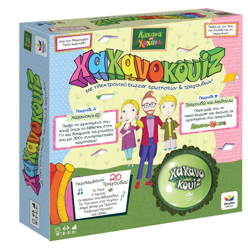 Οι αγαπημένοι ήρωες της Λαχανοχαχανοχώρας επιστρέφουν σε ένα παιχνίδι διαφορετικό και διασκεδαστικό! Παίξε το αγαπημένο σου κουίζ, ακριβώς όπως το βλέπεις στην τηλεόραση, και δοκίμασε τις γνώσεις σου με 300+ συναρπαστικές ερωτήσεις. Το ειδικό Buzzer ερωτήσεων περιλαμβάνει 20 από τα πιο αγαπημένα τραγούδια και μπορεί να χρησιμοποιηθεί σαν ηχείο όπου κι αν πας, προσφέροντας διασκέδαση σε κάθε στιγμή.