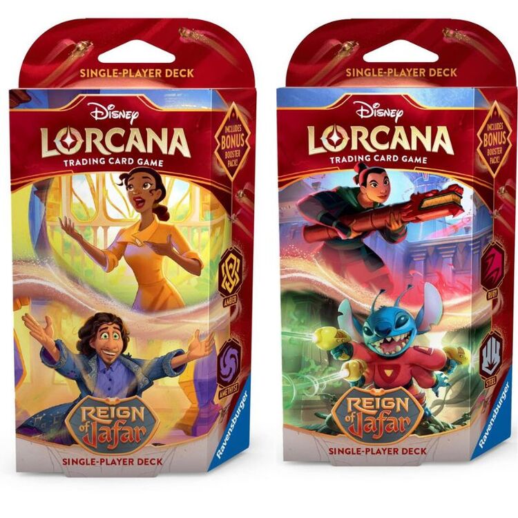 Για να παίξετε το Disney Lorcana, κάθε παίκτης θα χρειαστεί ένα πακέτο 60 καρτών. Τα έτοιμα προς χρήση starter decks περιλαμβάνουν ένα προκατασκευασμένο deck με μια συγκεκριμένη λίστα καρτών. Εάν είστε νέοι στα παιχνίδια καρτών ή θέλετε να ζήσετε την εμπειρία του παιχνιδιού με ένα deck που έχει σχεδιαστεί και δοκιμαστεί από την ομάδα του Lorcana, αυτό είναι το ιδανικό σημείο για να ξεκινήσετε.