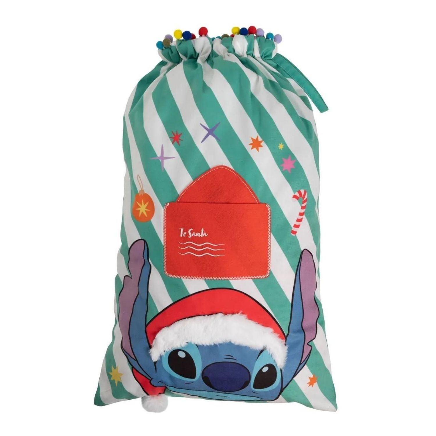 Αυτός ο πανέμορφος χριστουγεννιάτικος σάκος φέρει την μαγεία της Disney και είναι ιδανικός για fans όλων των ηλικιών. Ο σάκος είναι σε έντονους πράσινους και λευκούς τόνους, με μία μεγάλη εκτυπωμένη εικόνα του Stitch από το Lilo & Stitch. Το σχέδιο ολοκληρώνεται με τεχνητή γούνα και μια τσέπη με φάκελο “To Santa”. Η ανοιχτή πλευρά κλείνει με κορδόνι, στο οποίο είναι προσαρμοσμένα πολύχρωμα πομ πομ.
