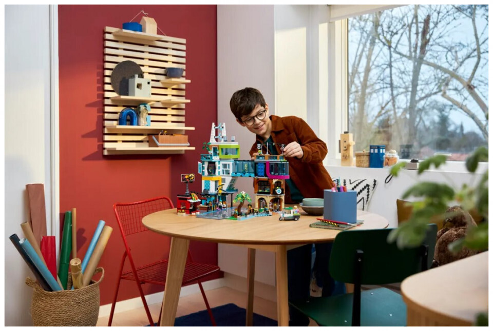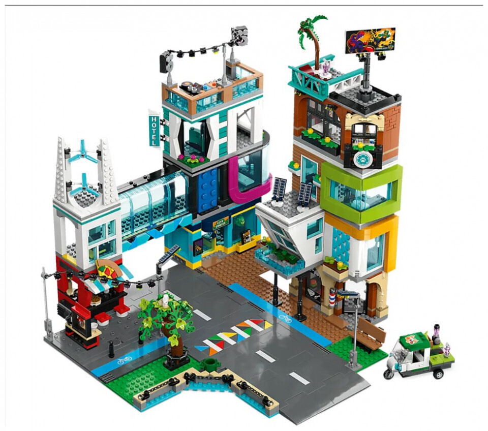 Καλώς ήρθες στο Κέντρο της Πόλης της LEGO® City. Υπάρχει ένα πάρκο, κουρείο, κτηνιατρική κλινική, στούντιο blogging και ντισκοτέκ στην ταράτσα. Μια σκεπαστή γέφυρα οδηγεί σε ένα δεύτερο 3ώροφο κτίριο με κατάστημα κόμικ, κατάστημα με είδη τεχνολογίας, δωμάτιο επιστάτη και ένα μοντέρνο ξενοδοχείο. Ηλιακά πάνελ και ανεμογεννήτριες παρέχουν πράσινη ενέργεια, ενώ η γραφική περιοχή με street-food προσφέρει στους πολίτες πίτσες, φρέσκους χυμούς και νουντλς. Αυτό το μέρος είναι απίθανο!