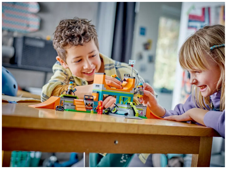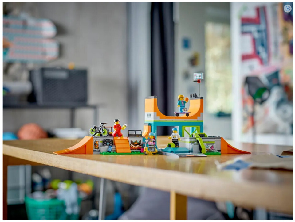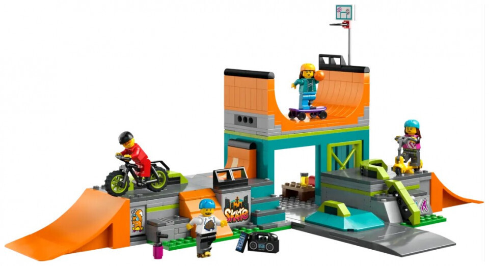 Πιάσε τον εξοπλισμό ασφαλείας σου και πήγαινε στο LEGO® City Πάρκο Σκέιτ στον Δρόμο. Διάλεξε ανάμεσα σε ποδήλατο BMX, σκέιτμπορντ, σκούτερ ή πατίνια. Άλλαξε και συνδύασε τις ράμπες και τον εξοπλισμό για να κάνεις όλων των ειδών τα ακροβατικά κόλπα. Πιάσε τη μπάλα του μπάσκετ και απογειώσου με μεγάλη ταχύτητα για ένα ιπτάμενο κάρφωμα στο καλάθι! Υπάρχει επίσης χώρος όπου μπορείς να απολαύσεις ένα αναψυκτικό με τους σκέιτερ φίλους σου. Αυτό το πάρκο είναι απλώς απίθανο!