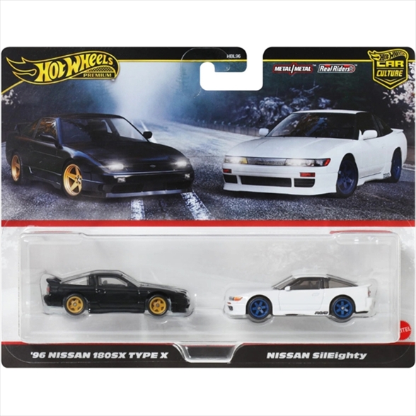 Ανακαλύψτε τον συναρπαστικό κόσμο των ιαπωνικών JDM αυτοκινήτων με αυτό το συλλεκτικό Hot Wheels® Premium Car Culture 2-Pack, που περιλαμβάνει τα '96 Nissan 180SX Type X & Nissan SilEighty!