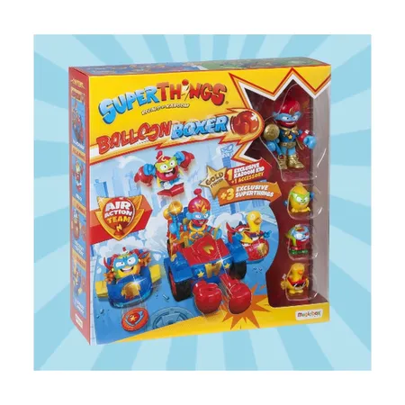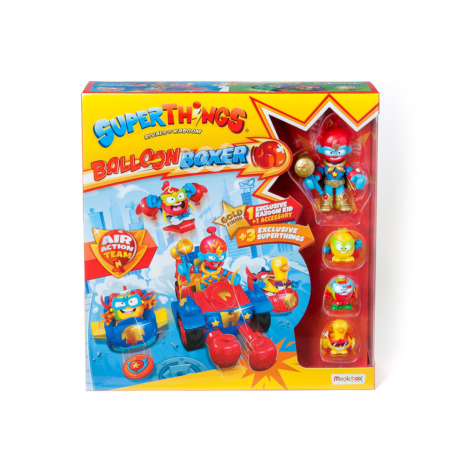 Ο υπερήρωας Balloon Boxer μπαίνει στη μάχη με το εντυπωσιακό όχημά του, το οποίο όχι μόνο θαμπώνει με τις χρυσαφί λεπτομέρειες, αλλά είναι επίσης σε θέση να ξεπεράσει κάθε κατάσταση με τις δυνατές γροθιές του! Θα μπορέσει να νικήσει; Φυσικά, γιατί δεν είναι μόνος του! Συνοδεύεται από την ομάδα Air Action Team, η οποία μπορεί να προσκολληθεί στο κύριο όχημα και να εκτοξεύσει δίσκους. Το μέγα όχημα Balloon Boxer είναι έτοιμο να μεταφέρει τους πάντες και να υπερασπιστεί την Kaboom City! Το σετ περιέχει 1 ήρωα Kazoom Kid και 3 αποκλειστικά SuperThings, προσφέροντας ατελείωτες ώρες παιχνιδιού και περιπέτειας.