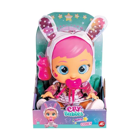 Τα Cry Babies Stars, όπως η Coney, έρχονται κατευθείαν από τα αστέρια για να σας συναντήσουν! Τα μάτια της Coney φωτίζουν με λαμπερά αστεράκια, και τα ρουχαλάκια της ιριδίζουν και λάμπουν σαν τα αστέρια! Αν της βγάλετε την πιπίλα, θα αρχίσει να κλαίει σαν αληθινό μωρό, και κάθε φορά που κλαίει, κάτι μαγικό συμβαίνει: δείτε αστέρια να λάμπουν μέσα στα μάτια της! Τα Cry Babies είναι διαδραστικές κούκλες μωρά που κλαίνε με αληθινά δάκρυα και κάνουν πάνω από 10 ήχους μωρού. Δώστε τους την πιπίλα ή το μπιμπερό τους και φροντίστε τα για να σταματήσουν να κλαίνε.