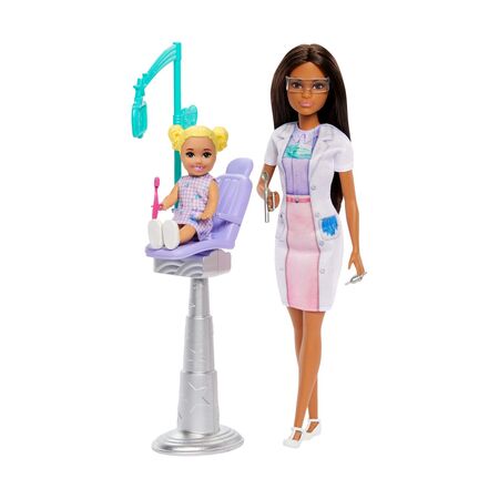 Τα παιδιά μπορούν να εξερευνήσουν διάφορους επαγγελματικούς ρόλους, συμπεριλαμβανομένου του οδοντίατρου! Με αυτό το σετ οδοντιατρικής, τα παιδιά μπορούν να εξετάσουν τα δόντια με την κούκλα Barbie Οδοντίατρο, που φοράει το εκτυπωμένο φόρεμα και το λευκό εργαστηριακό παλτό, μαζί με τον μικρό ασθενή της! Με την καρέκλα εξέτασης, η Barbie μπορεί να ελέγξει τα δόντια χρησιμοποιώντας αξεσουάρ όπως οδοντιατρικά εργαλεία, οδοντόβουρτσα και οδοντόκρεμα. Η φαντασία των παιδιών μπορεί να δημιουργήσει έναν κόσμο γεμάτο ιστορίες και ευκαιρίες καριέρας με αυτή την ισχυρή κούκλα που εμπνέει τα παιδιά να γίνουν οτιδήποτε ονειρεύονται! Η κούκλα δεν μπορεί να σταθεί μόνη της. Τα χρώματα και οι διακοσμήσεις ενδέχεται να διαφέρουν.