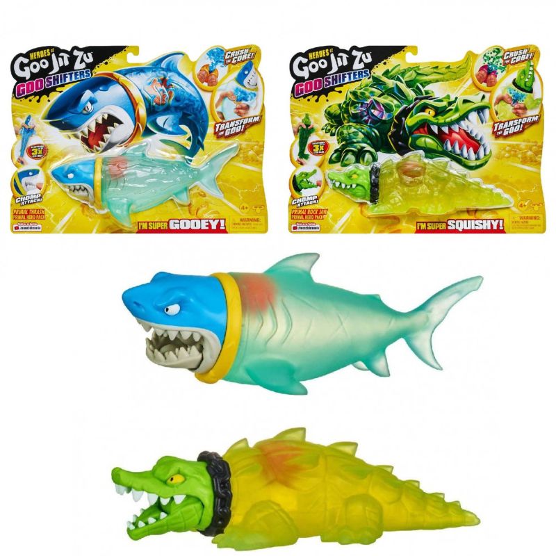 Οι ήρωες Goo Jit Zu επιστρέφουν πιο εντυπωσιακοί από ποτέ με τη νέα σειρά Goo Shifters, μεταφέροντάς μας στην primal εποχή των ηρώων! Ο Rock Jaw και ο Thrash εμφανίζονται σε πρωταρχική μορφή ως κροκόδειλος και καρχαρίας αντίστοιχα, με υπέροχα ζουληχτή υφή και δυναμική εμφάνιση. Με ύψος 20cm, αυτές οι φιγούρες μπορούν να τεντωθούν μέχρι και τα 50cm, προσφέροντας μοναδική αίσθηση παιχνιδιού. Ζούληξε τον πυρήνα της κάθε φιγούρας για να δεις τη μεταμόρφωση της goo ενέργειας στο εσωτερικό της! Διαθέτουν πανίσχυρα σαγόνια με στόμα που ανοιγοκλείνει, προσφέροντας μια εντυπωσιακή εμπειρία δράσης. Κάθε φιγούρα διατίθεται ξεχωριστά και σε τυχαία επιλογή, ανάμεσα στα δύο σχέδια: Primal Rock Jaw ή Primal Thrash.