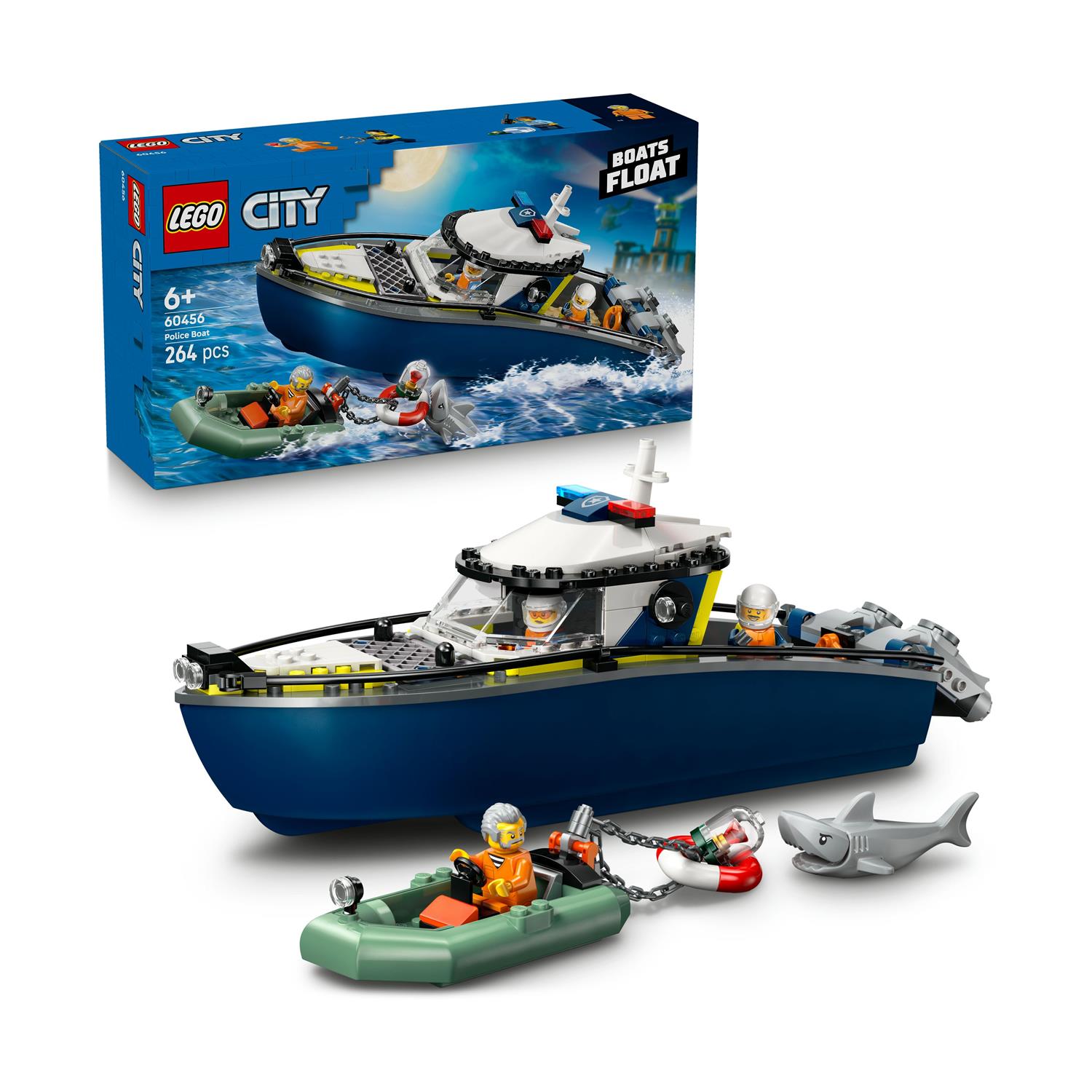 Ένας πονηρός κακοποιός με ένα σούπερ γρήγορο φουσκωτό φεύγει από το λιμάνι της LEGO® City ρυμουλκώντας ένα κλεμμένο ρουμπίνι. Μπες στη δράση με τους αστυνομικούς στο πανίσχυρο αστυνομικό σκάφος που έχει ό,τι χρειάζεσαι για να πιάνεις κακοποιούς, όπως δύο εξωλέμβιες μηχανές και κελί. Απόφυγε τον πεινασμένο καρχαρία και σκίσε τα κύματα να σώσεις την κατάσταση. Η καταδίωξη ξεκίνησε στη LEGO City!