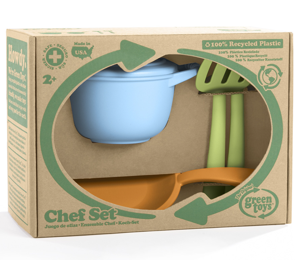Σετ Σεφ. Αυτή η κλασσική συλλογή απαραίτητων αξεσουάρ για την κουζίνα κατασκευάζεται στις ΗΠΑ από 100% ανακυκλωμένα μπουκάλια γάλακτος. Είναι απολύτως ασφαλή, χωρίς χημικά στοιχεία και συμμορφώνονται με τους κανονισμούς του FDA για την επαφή με τρόφιμα. Το σετ πλένεται εύκολα και με ασφάλεια στο πλυντήριο πιάτων, καθιστώντας το πρακτικό για χρήση. Είναι σίγουρο ότι θα προσφέρει ατέλειωτες ώρες οικολογικής διασκέδασης για τα παιδιά.