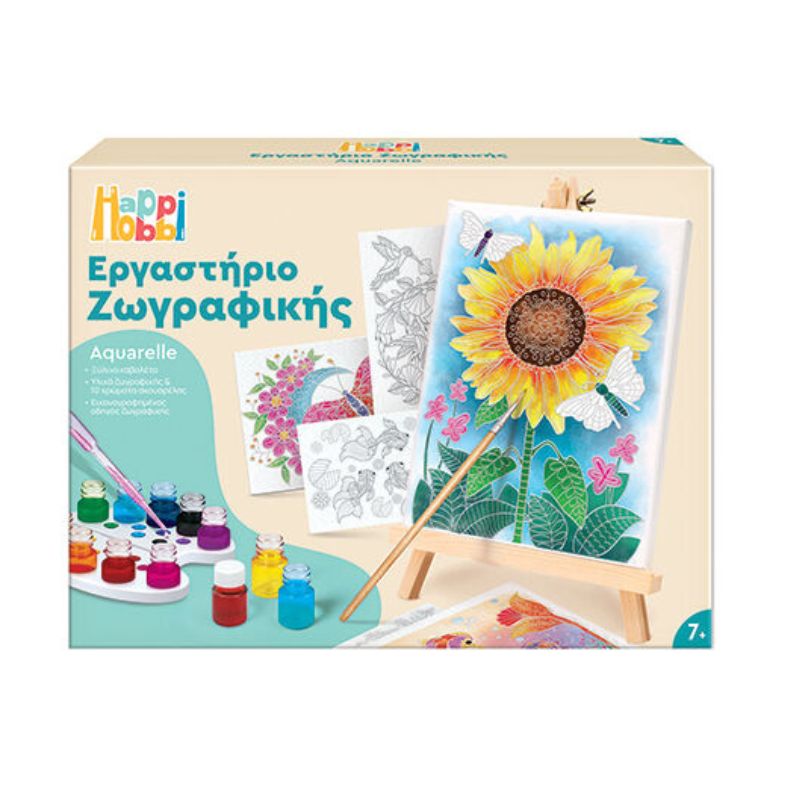Το HappiHobbi Εργαστήριο Ζωγραφικής Aκουαρέλα είναι το ιδανικό σετ για να μάθει το παιδί να ζωγραφίζει με την τεχνική της ακουαρέλας. Με το ξύλινο καβαλέτο και τις έξι προτυπωμένες καρτολίνες με περιγράμματα κεριού, το παιδί μπορεί να ζωγραφίσει άφοβα, δημιουργώντας εντυπωσιακά σχέδια. Όταν αποκτήσει περισσότερη αυτοπεποίθηση, μπορεί να ζωγραφίζει ελεύθερα στον λευκό καμβά, πειραματιζόμενο με τις μίξεις χρωμάτων. Ο εικονογραφημένος οδηγός βοηθά στην εκμάθηση της τεχνικής και στις δημιουργικές μίξεις χρωμάτων.