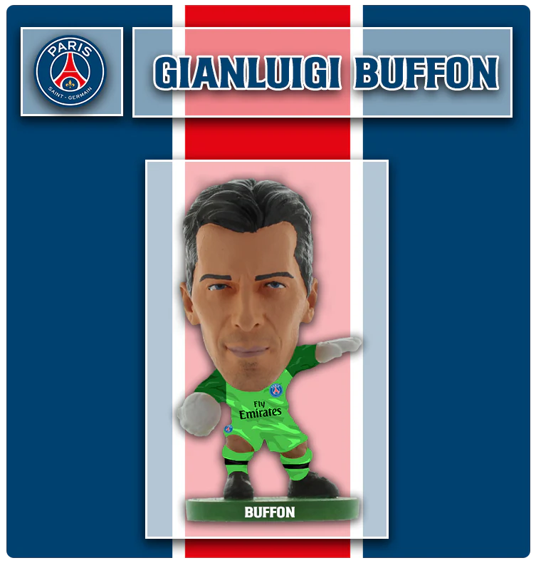 Η φιγούρα Gianluigi Buffon SoccerStarz παρουσιάζει τον θρυλικό τερματοφύλακα της Paris Saint-Germain φορώντας τη φανέλα εντός έδρας της σεζόν 2019. Με ύψος περίπου 5 εκατοστά και σταθερή πράσινη βάση, αυτή η συλλεκτική φιγούρα αποτυπώνει με μεγάλη λεπτομέρεια την εικόνα ενός από τους καλύτερους τερματοφύλακες στην ιστορία του ποδοσφαίρου. Είναι ιδανική για συλλέκτες αλλά και για τους μικρούς φίλους του ποδοσφαίρου, καθώς είναι επίσημα αδειοδοτημένη και κατάλληλη για ηλικίες 4 ετών και άνω.