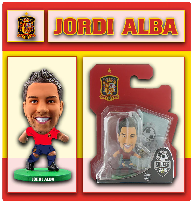 Η φιγούρα Jordi Alba SoccerStarz απεικονίζει τον ταχύτατο αριστερό μπακ της Ισπανίας φορώντας τη χαρακτηριστική κόκκινη φανέλα της εθνικής ομάδας. Με ύψος περίπου 5 εκατοστά και σταθερή πράσινη βάση, αυτή η συλλεκτική φιγούρα αποτελεί την ιδανική προσθήκη για κάθε φαν της Ισπανίας ή συλλέκτη ποδοσφαιρικών φιγούρων. Ο Jordi Alba ξεχωρίζει για την ταχύτητα, την τεχνική του και τη συμβολή του στην επιθετική ανάπτυξη της ομάδας.