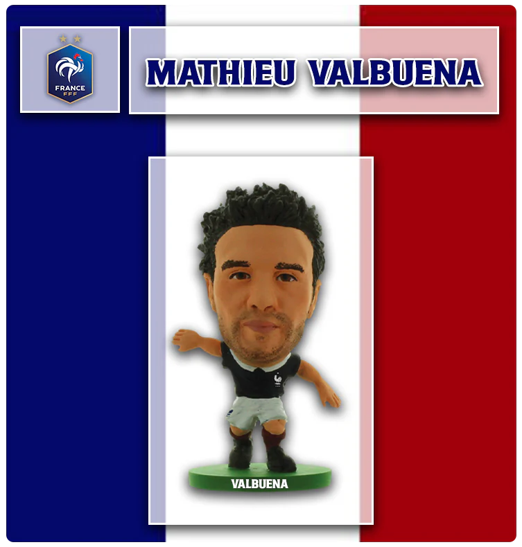 Η φιγούρα Mathieu Valbuena από τη σειρά SoccerStarz παρουσιάζει τον Γάλλο μέσο στην εμφάνιση του 2014. Αυτή η μικρή φιγούρα είναι ιδανική για συλλέκτες που αγαπούν το ποδόσφαιρο και θέλουν να προσθέσουν έναν από τους πιο χαρακτηριστικούς παίκτες της Γαλλίας στη συλλογή τους. Με ύψος περίπου 5 εκατοστά, η φιγούρα είναι χειροποίητα βαμμένη για να αποδώσει με πιστότητα τα χαρακτηριστικά του παίκτη.