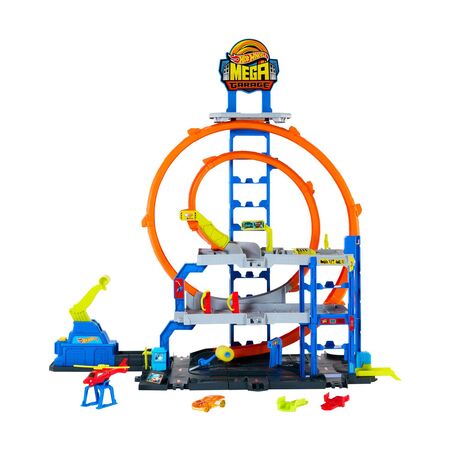 Το σετ παιχνιδιών Hot Wheels Mega Loop Garage διαθέτει τρία επίπεδα παιχνιδιού με επίκεντρο το αυτοκίνητο για να εμπλέξει τους μικρούς οδηγούς σε ευφάνταστες ιστορίες και επικές φιγούρες. Στο βασικό πάτωμα αυτού του σετ πολλαπλών επιπέδων, τα παιδιά μπορούν να οδηγήσουν το αυτοκίνητό τους μέσα από ένα πλυντήριο αυτοκινήτων. Στη συνέχεια, φορτώστε το αυτοκίνητο στον εκτοξευτή slam και στείλτε το στον διπλό διάδρομο, όπου οι εκτροπείς βοηθούν να οδηγηθεί στον επιθυμητό όροφο. Χρησιμοποιήστε έναν ανελκυστήρα που κινείται από τα παιδιά ή χρησιμοποιήστε το ελικόπτερο μεταφοράς αυτοκινήτων για να μεταφέρετε τα οχήματα σε οποιοδήποτε επίπεδο για στάθμευση. Επεκτείνετε το παιχνίδι χρησιμοποιώντας τους συνδέσμους Speed Snap Track.