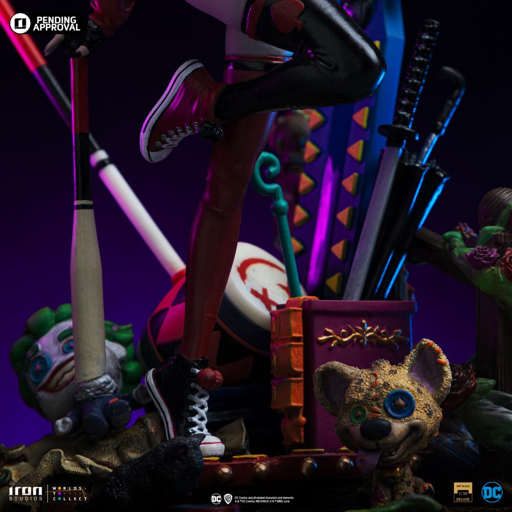 Η Harley Quinn, η Maid of Mischief της Gotham, παρουσιάζεται σε αυτήν την εκπληκτική φιγούρα που αποτυπώνει την επικίνδυνη γοητεία της μέσα σε ένα σκηνικό γεμάτο λεπτομέρειες και συμβολισμούς. Στηρίζεται στο αριστερό της πόδι ενώ το δεξί της χέρι κρατάει ένα μπαστούνι του μπέιζμπολ που συνθλίβει μια χειροποίητη κούκλα του Joker, του πρώην της εραστή και τώρα εχθρού της. Κοντά της, στηρίζεται στο ξύλινο κάγκελο με κισσούς και κόκκινα λουλούδια, ένα παιχνίδι High Striker με σπασμένο επάνω μέρος που απεικονίζει την Punchline, τη νέα ακόλουθο του Joker, ενώ δίπλα της βρίσκεται μια κούτα με όπλα και γκάτζετ τοπικών εγκληματιών, ανάμεσά τους η ζώνη εργαλείων της αντίπαλης ηρωίδας. Δίπλα, η κούκλα του κατοικιδίου της, της ύαινας Bruce, και δύο γατάκια που παίζουν ανάμεσα σε χρυσά νομίσματα και φυτά, δίνουν την αίσθηση της άγριας και παράξενης συμμορίας που ανήκει.