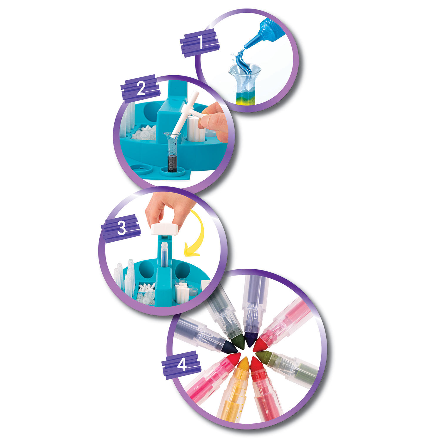 Εργαστήριο μαρκαδόρων, θήκη αποθήκευσης, οδηγός ανάμιξης, 3 μπουκαλάκια μελανιού, εξαρτήματα για 16 μαρκαδόρους, τσιμπίδα, 2 δοσομετρητές, 10 σελίδες Α5, 16 αυτοκόλλητα, εγχειρίδιο οδηγιών.