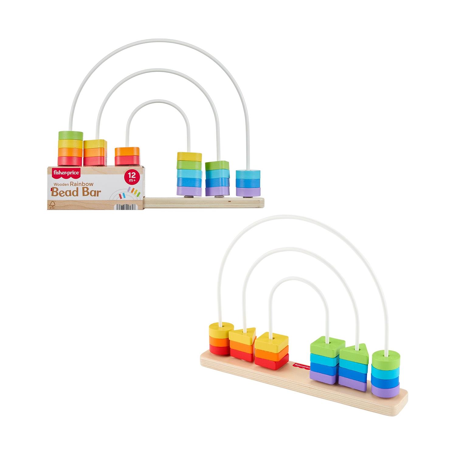Η ξύλινη μπάρα χαντρών της Fisher-Price Rainbow Bead Bar επιτρέπει στα νήπια να εξερευνήσουν σχήματα, χρώματα και πρώτη αρίθμηση μέσα από ένα διασκεδαστικό παιχνίδι με χάντρες που γλιστρούν. Κατασκευασμένο από ξύλο πιστοποιημένο από το Forest Stewardship Council (FSC-N004566) και διακοσμημένο με μη τοξικό χρώμα με βάση το νερό, αυτό το κλασικό παιχνίδι πρώιμης μάθησης διαθέτει 21 πολύχρωμες χάντρες σε 3 διαφορετικά σχήματα, τις οποίες τα παιδιά μπορούν να πιάσουν και να σύρουν μπρος-πίσω στις ράβδους.