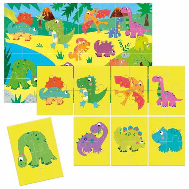 Με μεγάλα κομμάτια διπλής όψεως, το παιχνίδι αυτό είναι ιδανικό για πολύ μικρά παιδιά. Από τη μία πλευρά, μπορούν να φτιάξουν τα παζλ 8 απολαυστικών δεινοσαύρων, ενώ από την άλλη μπορούν να συναρμολογήσουν ένα μεγάλο προϊστορικό περιβάλλον.
