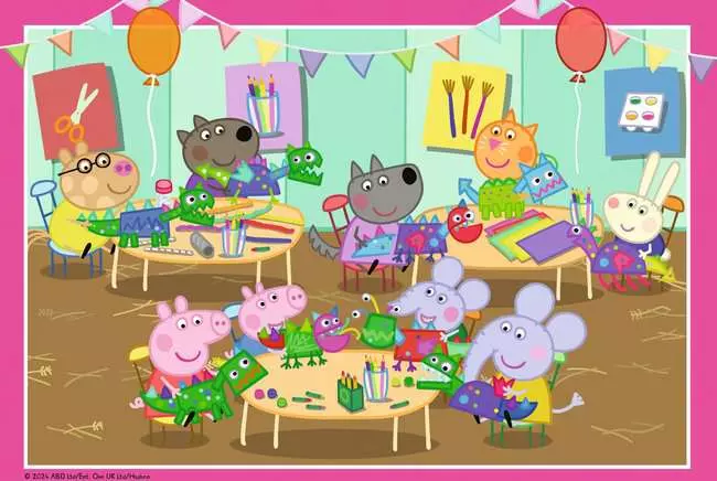 Η γιορτή ξεκινά! Στολισμένα τραπέζια, σημαίες παντού και η Peppa Pig ετοιμάζεται να γιορτάσει διπλά! Πρώτα με την οικογένειά της, τους Mummy Pig, Daddy Pig, George Pig, Granny και Grandpa Pig σε ένα γιορτινό γεύμα, και δεύτερον με τους φίλους της σε ένα δημιουργικό παιδικό πάρτι με τον Edmond Elephant, Emily Elephant, Pedro Pony, Candy Cat, Rebecca Rabbit, Danny Dog, Wendy Wolf και φυσικά τον μικρό George. Αυτό το 2x12 κομματιών παζλ είναι ιδανικό για στιγμές χαλάρωσης και διασκέδασης με τα αγαπημένα θέματα των παιδιών.