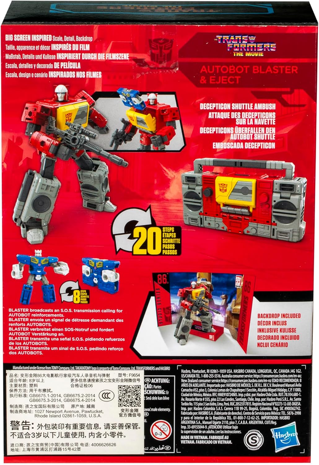 Το Autobot Blaster από τη σειρά Transformers Studio Series Voyager φέρνει στη ζωή τις πιο εμβληματικές σκηνές των ταινιών Transformers με λεπτομέρειες υψηλής πιστότητας και πιστή αναπαράσταση του χαρακτήρα. Η συλλεκτική φιγούρα 16,5 cm (6.5”) διαθέτει κλασική μετατροπή σε δύο λειτουργίες, από ρομπότ σε boombox, σε 20 βήματα, ενώ η συνοδευτική φιγούρα Eject μετατρέπεται από ρομπότ σε mini‑cassette σε 8 βήματα και μπορεί να τοποθετηθεί στο στήθος του Autobot Blaster σε μορφή κασέτας.