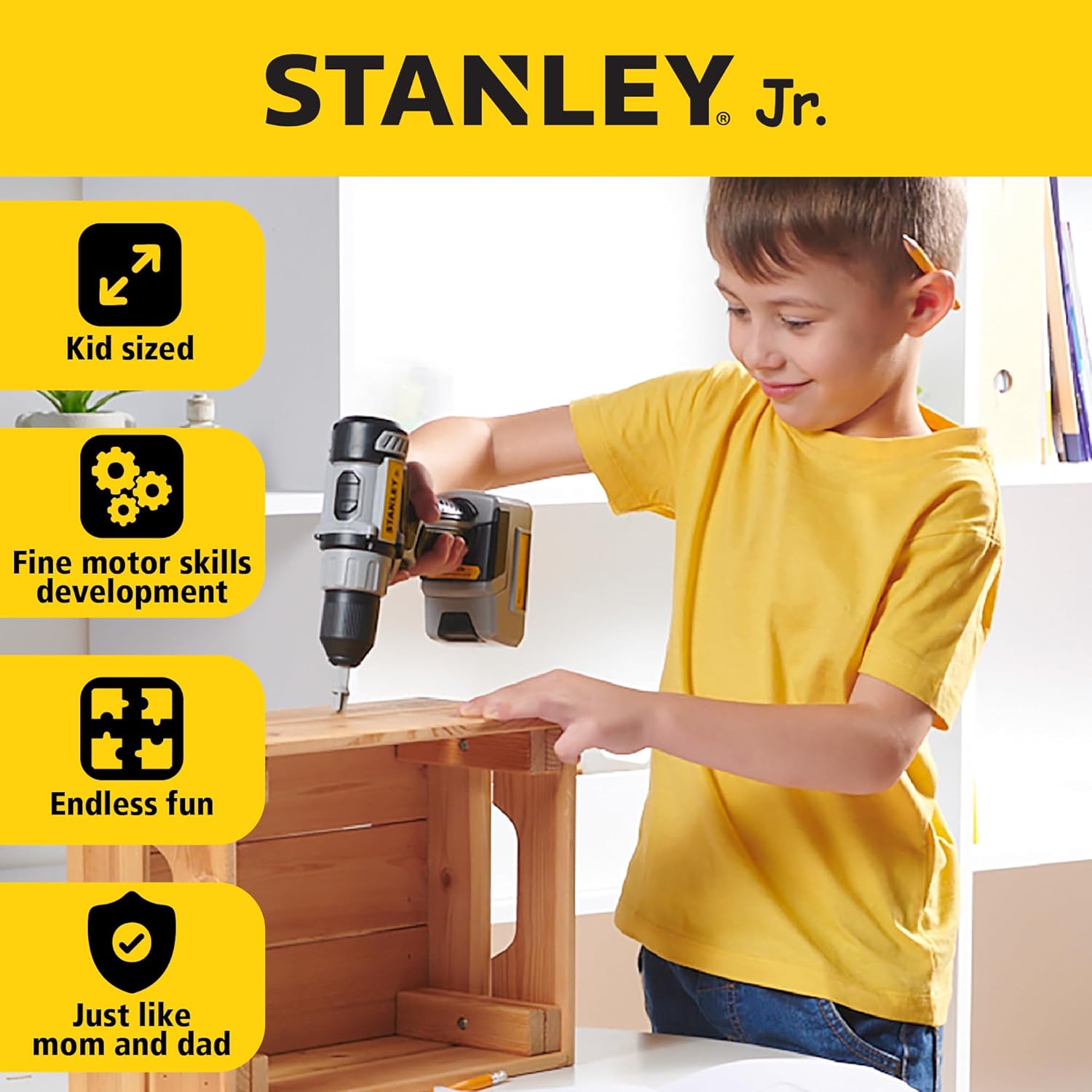 Το Stanley Jr. Battery Powered Drill φέρνει την εμπειρία του πραγματικού εργαλείου στο παιχνίδι! Αυτό το ηλεκτροκίνητο δράπανο κινείται, παράγει ήχους και φωτίζεται όπως ένα κανονικό δράπανο, προσφέροντας μια ρεαλιστική εμπειρία για μικρούς τεχνίτες. Είναι εύκολο στη χρήση: τα παιδιά απλώς πατούν ένα κουμπί για να ξεκινήσει η δράση και να παίξουν αμέσως. Κατάλληλο για παιδιά 3+, κατασκευασμένο από ανθεκτικό πλαστικό και μπαταρίες, προσφέρει ατελείωτες ώρες δημιουργικού παιχνιδιού, επιτρέποντας στα παιδιά να υποδυθούν ρόλους όπως ξυλουργοί και τεχνίτες.