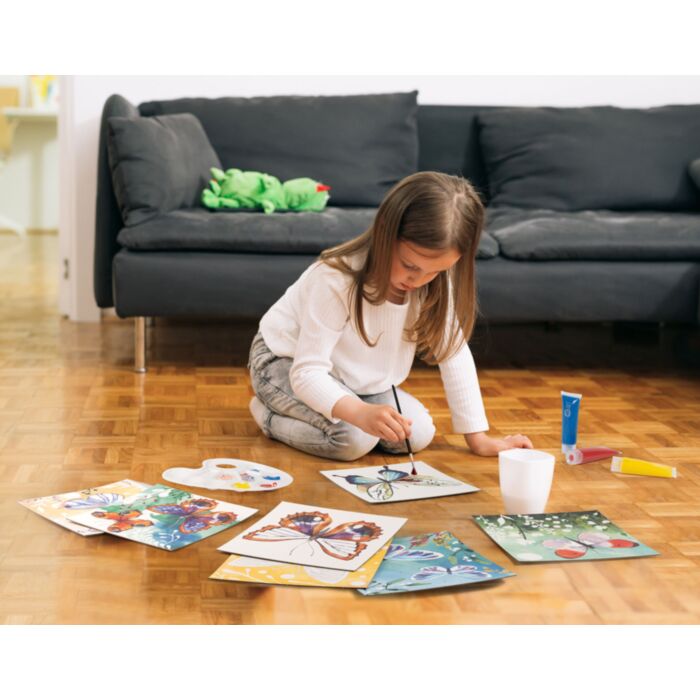 Το AS Art Watercolors Butterflies είναι ένα εκπαιδευτικό σετ ζωγραφικής που καθοδηγεί το παιδί βήμα-βήμα στη χρήση πινέλου και νερομπογιών, δημιουργώντας εντυπωσιακά έργα τέχνης για διακόσμηση του παιδικού δωματίου. Το σετ περιλαμβάνει 7 προτυπωμένες και ημιχρωματισμένες καρτολίνες, οι οποίες προσφέρουν διαβαθμισμένη δυσκολία ώστε το παιδί να μάθει σταδιακά την τεχνική της ζωγραφικής με νερομπογιές. Ο αναλυτικός εικονογραφημένος οδηγός ξεκινά από απλό χρωματισμό ενός χρώματος στα πιο εύκολα σχέδια πεταλούδων και φτάνει σε μίξεις χρωμάτων στα πιο δύσκολα, προσφέροντας συστηματική εξοικείωση με τα εργαλεία ζωγραφικής. Μέσα από τη διαδικασία, το παιδί διασκεδάζει, μαθαίνει και απασχολείται δημιουργικά, μακριά από οθόνες. Η σειρά AS Art προσφέρει παιδαγωγικά μελετημένα σετ ζωγραφικής για παιδιά 2-10 ετών, ενισχύοντας τη φαντασία, την καλλιτεχνική έκφραση και την ανάπτυξη προσωπικού καλλιτεχνικού πορτφόλιου, χρησιμοποιώντας φιλικά προς το περιβάλλον φυσικά υλικά.